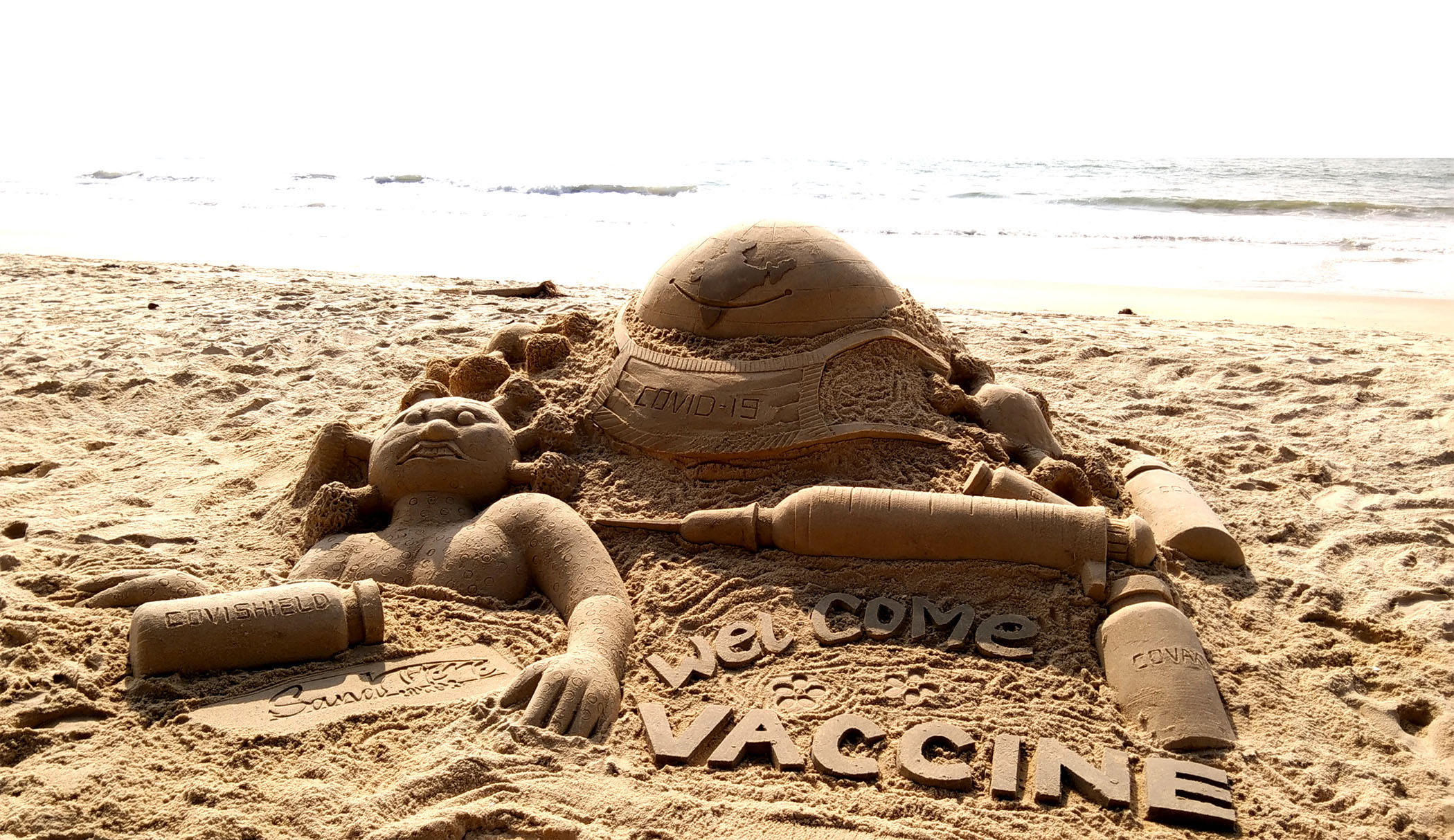 ‘ಕೊರೋನ ವ್ಯಾಕ್ಸಿನ್ಗೆ ಸ್ವಾಗತ’ ಮರಳು ಶಿಲ್ಪ ಕೃತಿ