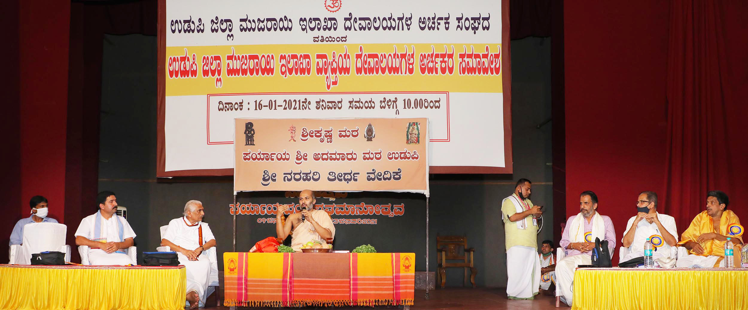 ಉಡುಪಿ, ಜ.16: ಉಡುಪಿ ಜಿಲ್ಲಾ ಮುಜರಾಯಿ ಇಲಾಖಾ ದೇವಾಲಯ ಗಳ ಅರ್ಚಕ ಸಂಘದ ವತಿಯಿಂದ ಜಿಲ್ಲಾ ಧಾರ್ಮಿಕ ಪರಿಷತ್ನ ಸಹಯೋಗ ದೊಂದಿಗೆ ಉಡುಪಿ ಜಿಲ್ಲಾ ಮುಜರಾಯಿ ಇಲಾಖಾ ವ್ಯಾಪ್ತಿಯ ದೇವಾಲಯ ಗಳ ಅರ್ಚಕ ಸಮಾವೇಶ ಇಂದು ಪರ್ಯಾಯ ಅದಮಾರು ಮಠದ ಆಶ್ರಯದಲ್ಲಿ ಉಡುಪಿ ಶ್ರೀಕೃಷ್ಣ ಮಠದ ರಾಜಾಂಗಣದ ನರಹರಿ ತೀರ್ಥ ವೇದಿಕೆಯಲ್ಲಿ ನಡೆಯಿತು.