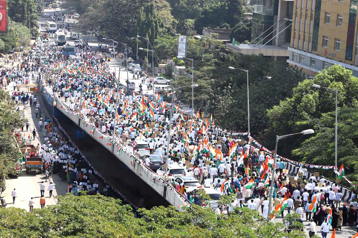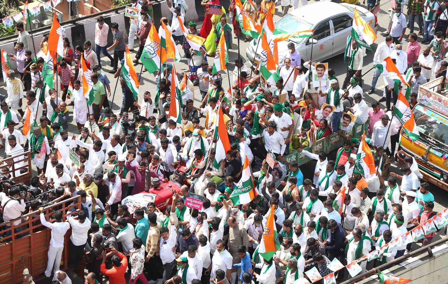 ಕಂಗೊಳಿಸಿದ ಕಾಂಗ್ರೆಸ್ ಬಾವುಟ-ಹಸಿರು ಶಾಲು: ಇಲ್ಲಿನ ರೈಲ್ವೆ ನಿಲ್ದಾಣದಿಂದ ಫ್ರೀಡಂ ಪಾರ್ಕ್ ವರೆಗಿನ ಆನಂದರಾವ್ ವೃತ್ತ, ರೇಸ್ಕೋರ್ಸ್ ರಸ್ತೆ, ಕೆ.ಜಿ.ರಸ್ತೆ, ಗಾಂಧಿನಗರ ಸೇರಿದಂತೆ ಸುತ್ತಮುತ್ತಲ ಪ್ರದೇಶಗಳಲ್ಲಿ ಎಲ್ಲೆಡೆ ಕಾಂಗ್ರೆಸ್ ಬಾವುಟ, ಹಸಿರು ಶಾಲುಗಳೇ ಕಂಗೊಳಿಸಿದವು.