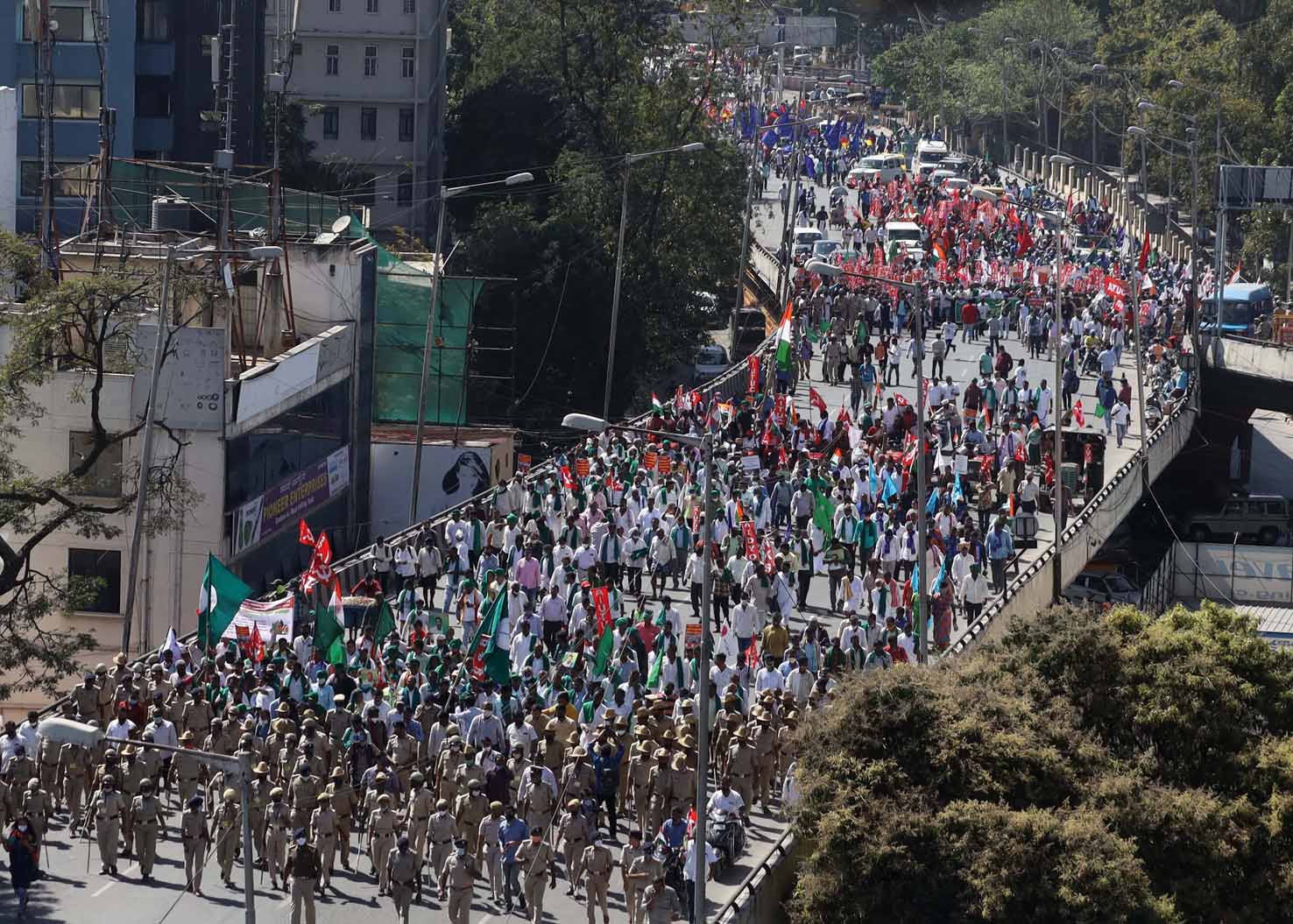 ಇಲ್ಲಿನ ಹೊರವಲಯದ ಟೋಲ್ಗೇಟ್ ಬಳಿ ಮಂಗಳವಾರ ಬೆಳಗ್ಗೆಯಿಂದಲೇ ನೂರಾರು ಪೊಲೀಸರನ್ನು ನಿಯೋಜಿಸಿದ್ದು, ರೈತರು ಸಾಗಿ ಬಂದ ರಸ್ತೆಯುದ್ದಕ್ಕೂ ಸಾವಿರಾರು ಪೊಲೀಸರು ಹಾಜರಿದ್ದರು.