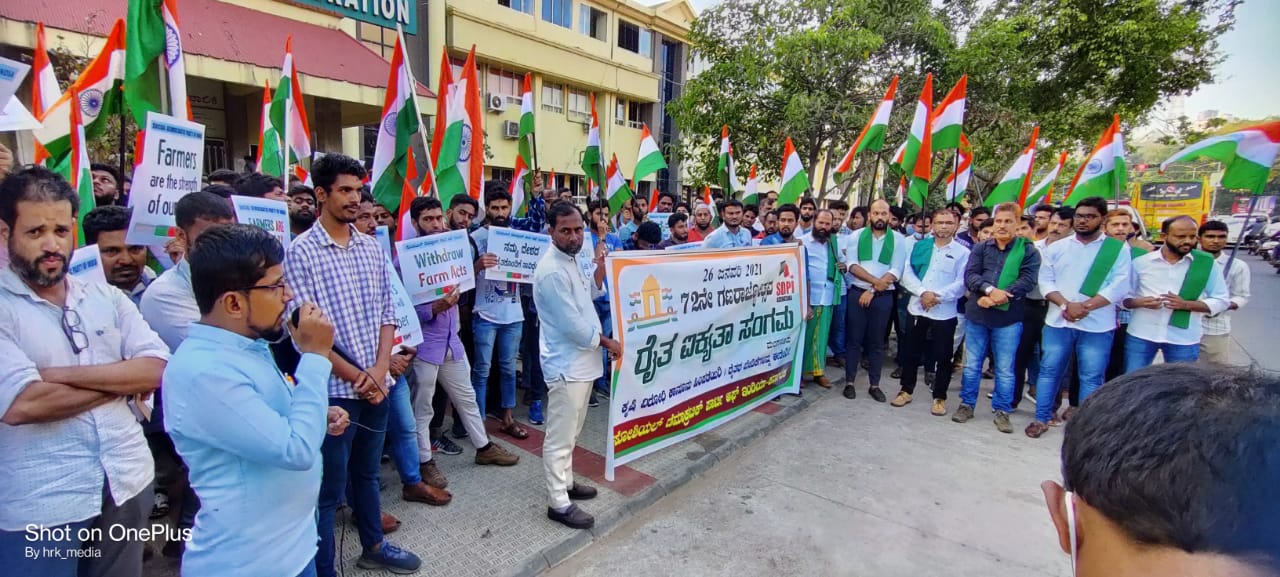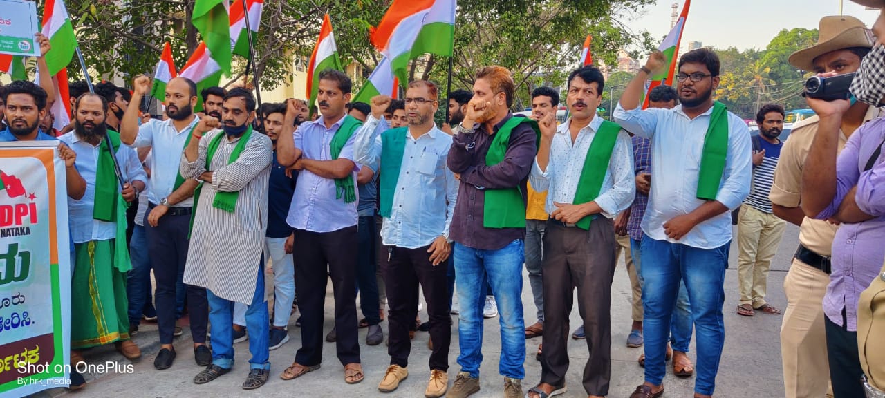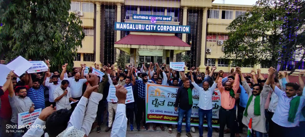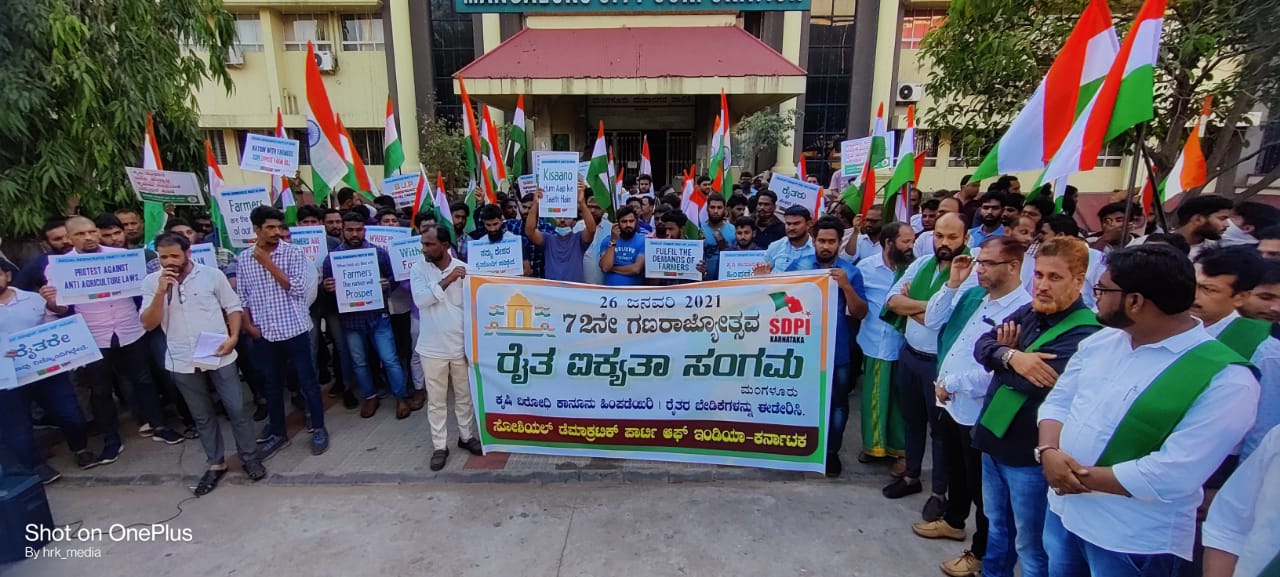 ಮಂಗಳೂರು : ಕೇಂದ್ರ ಸರಕಾರ ಇತ್ತೀಚಿಗೆ ಜಾರಿಗೆ ತರಲು ಹೊರಟಿರುವ ಕೃಷಿ ಮಸೂದೆಯ ವಿರುದ್ಧ ದೇಶದಾದ್ಯಂತ ರೈತರು ನಡೆಸುತ್ತಿರುವ ಪ್ರತಿಭಟನೆಗಳಿಗೆ ನೈತಿಕ ಬೆಂಬಲವಾಗಿ ಗಣರಾಜ್ಯೋತ್ಸವ ದಿನದಂದು ಎಸ್ಡಿಪಿಐ ದ.ಕ ಜಿಲ್ಲಾ ಸಮಿತಿ ವತಿಯಿಂದ ಮಂಗಳೂರು ಮಹಾನಗರ ಪಾಲಿಕೆ ಕಚೇರಿ ಮುಂಬಾಗದಲ್ಲಿ ರೈತ ಐಕ್ಯತಾ ಸಂಗಮ ಎಂಬ ಹೆಸರಿನಲ್ಲಿ ಪ್ರತಿಭಟನೆ ಹಮ್ಮಿಕೊಳ್ಳಲಾಯಿತು.