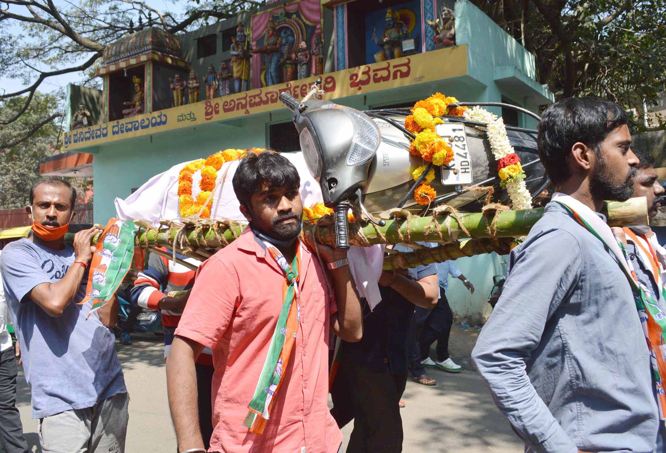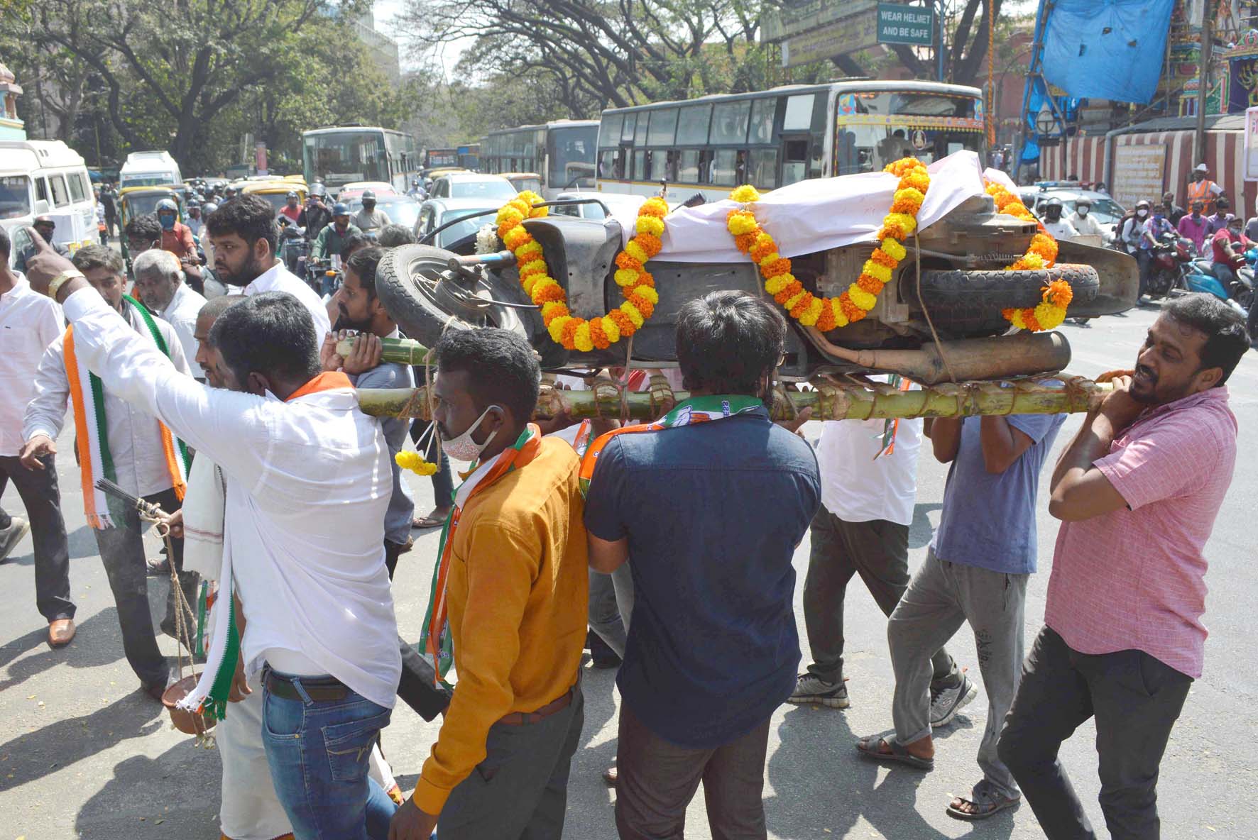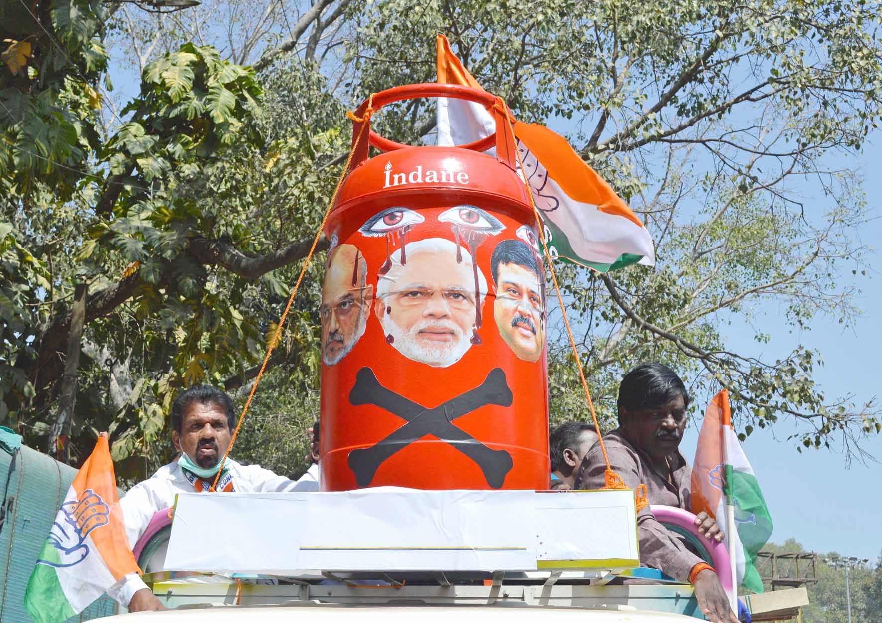 ಮಂಗಳವಾರ ನಗರದ ಮೈಸೂರು ಬ್ಯಾಂಕ್ ವೃತ್ತದಲ್ಲಿ ಕೆಪಿಸಿಸಿ ಕಾರ್ಯಾಧ್ಯಕ್ಷ ರಾಮಲಿಂಗಾರೆಡ್ಡಿ ನೇತೃತ್ವದಲ್ಲಿ ಜಮಾಯಿಸಿದ ನೂರಾರು ಕಾರ್ಯಕರ್ತರು, ಎತ್ತಿನಗಾಡಿ ಓಡಿಸಿ ಮತ್ತು ಸೌದೆ ಬಳಸಿ ಅಡುಗೆ ಮಾಡುವ ಮೂಲಕ ಕಾಂಗ್ರೆಸಿಗರು ತೈಲ ಬೆಲೆ ಏರಿಕೆ ಖಂಡಿಸಿದರು.