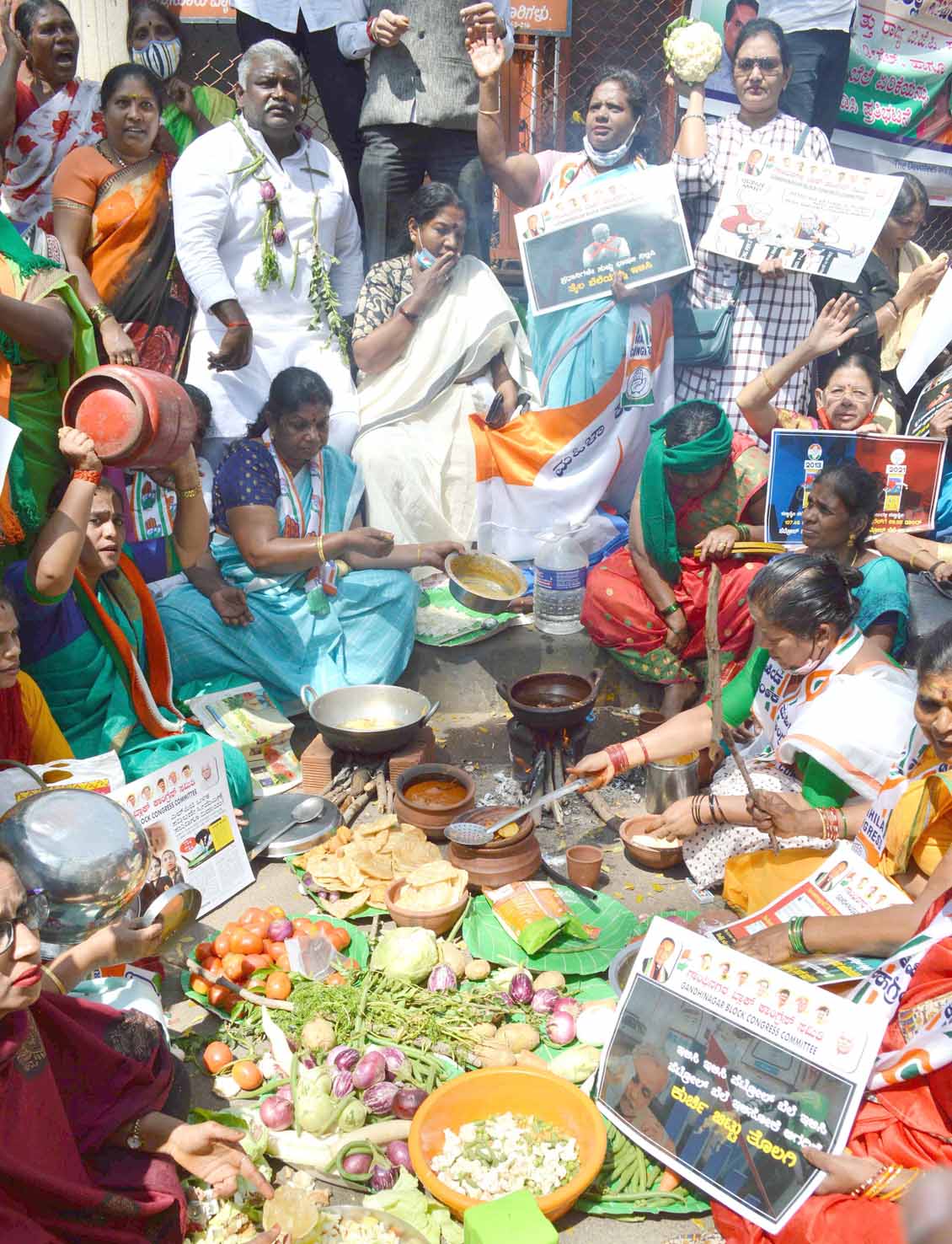 ಬೆಂಗಳೂರು: ಇಂಧನ ಬೆಲೆ ಏರಿಕೆ ಖಂಡಿಸಿ ಕಾಂಗ್ರೆಸ್ ಪ್ರತಿಭಟನೆ; ರಸ್ತೆಯಲ್ಲಿಯೇ ಅಡುಗೆ ಮಾಡಿದ ಕಾರ್ಯಕರ್ತರು