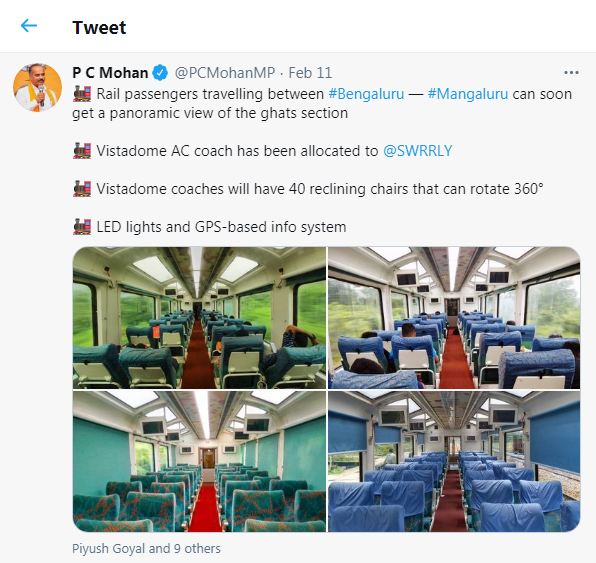 ಈ ಕುರಿತು ಟ್ವೀಟ್ ಮಾಡಿರುವ ಅವರು, ಬೆಂಗಳೂರು-ಮಂಗಳೂರು ಮಾರ್ಗದಲ್ಲಿ ಸಾಗುವ ರೈಲಿನಲ್ಲಿ ವಿಶೇಷವಾದ ಬೋಗಿಗಳನ್ನು ಅಳವಡಿಸಲಾಗುತ್ತಿದ್ದು, ಪ್ರಯಾಣಿಕರು 360 ಡಿಗ್ರಿಯಲ್ಲಿ ಸುತ್ತುವ ಕುರ್ಚಿಯಲ್ಲಿ ಕುಳಿತು ಶಿರಾಡಿ ಘಾಟಿನ ಸೌಂದರ್ಯವನ್ನು ಸವಿಯಬಹುದಾಗಿದೆ ಎಂದು ಮಾಹಿತಿ ನೀಡಿದ್ದಾರೆ.
