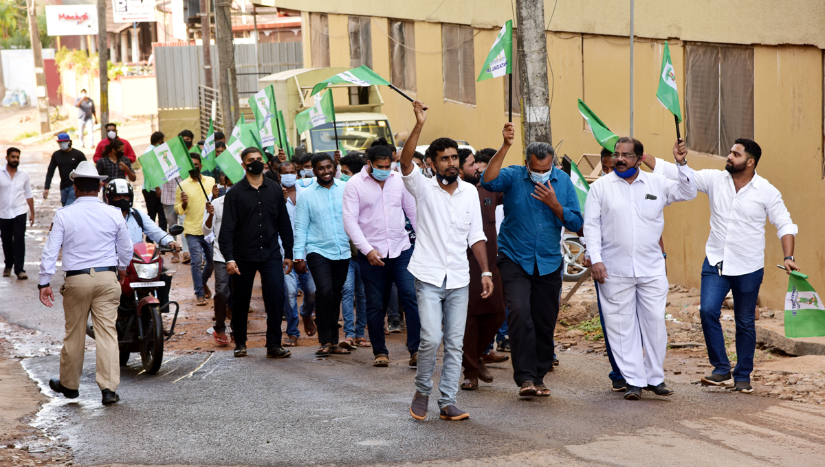 ನಗರದ ಪಿವಿಎಸ್ ಕಲಾಕುಂಜ ರಸ್ತೆ ಕಡೆಯಿಂದ ಜೆಡಿಎಸ್ ಕಾರ್ಯಕರ್ತರು ಬಿಜೆಪಿ ಸರಕಾರದ ವಿರುದ್ಧ ಹಾಗೂ 'ಜಗದೀಶ್ ಅಧಿಕಾರಿ ಉಚ್ಛಾಟಿಸಬೇಕು’ ಎಂಬ ಘೋಷಣೆ ಕೂಗುತ್ತಾ ಬಂದರು. ಈ ನಡುವೆ ಪೊಲೀಸರು ರಸ್ತೆ ಬಂದ್ ಮಾಡಿ, ಬ್ಯಾರಿಕೇಡ್ ಅಳವಡಿಸಿದ್ದರು.