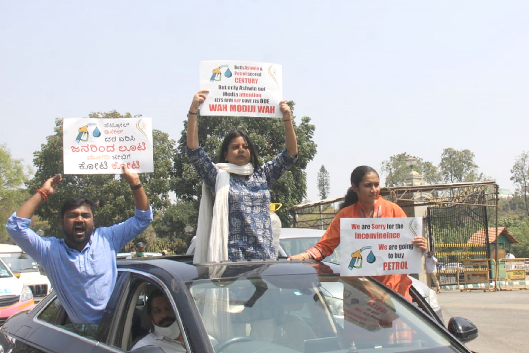 ಬೆಂಗಳೂರು, ಫೆ.17: ಕಳೆದ ಕೆಲ ದಿನಗಳಿಂದ ನಿರಂತರವಾಗಿ ಪೆಟ್ರೋಲ್, ಡೀಸೆಲ್ ದರಗಳು ಏರಿಕೆಯಾಗುತ್ತಿರುವುದನ್ನು ಖಂಡಿಸಿ ಕೇಂದ್ರದ ಬಿಜೆಪಿ ಸರಕಾರದ ವಿರುದ್ಧ ಯುವ ಕಾಂಗ್ರೆಸ್ ಘಟಕ ಪ್ರತಿಭಟನೆ ನಡೆಸಿತು.