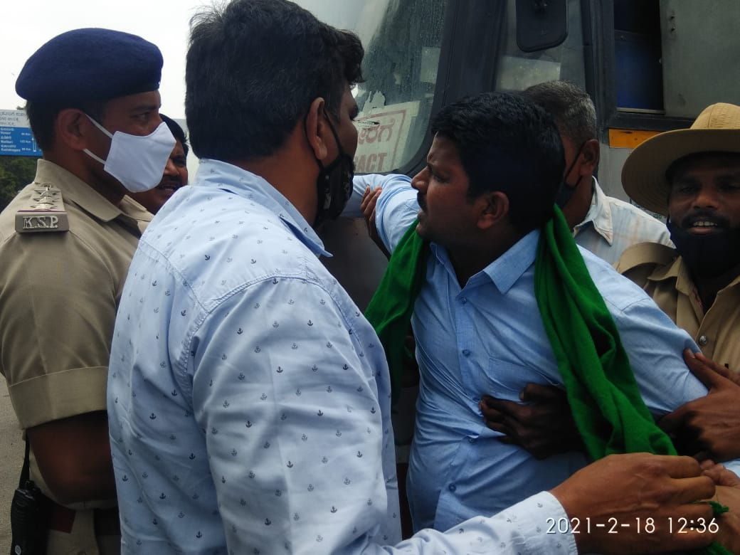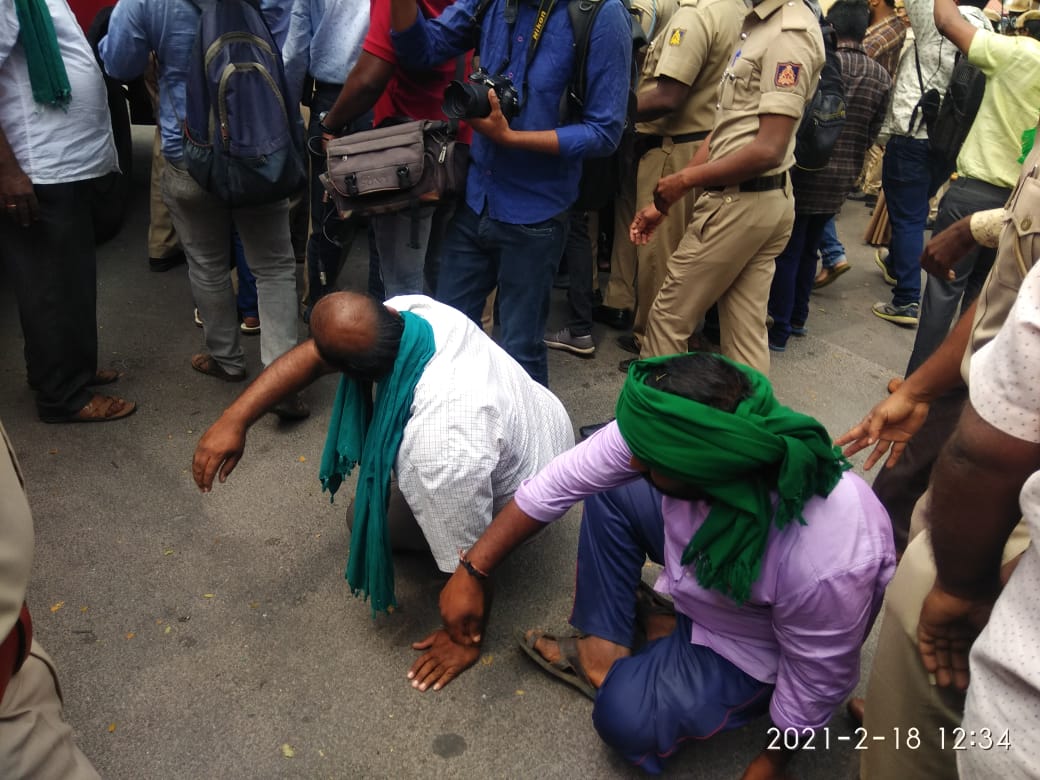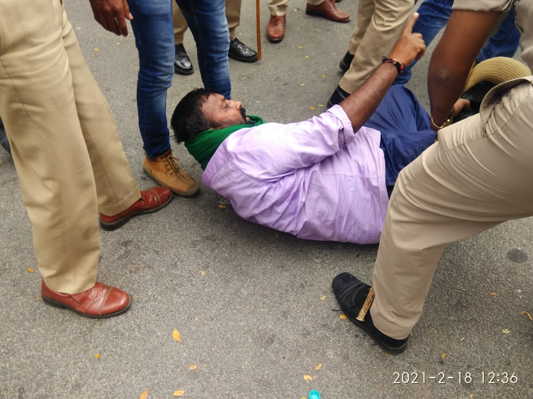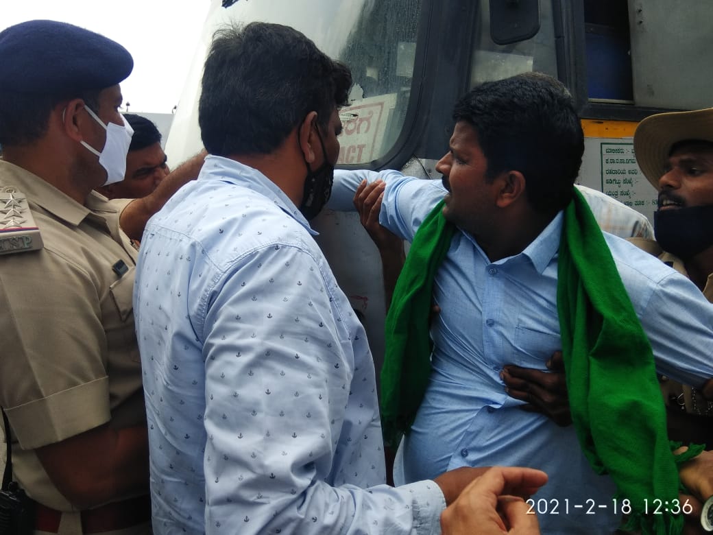 ಇದೇ ವೇಳೆ ರೈತನೋರ್ವ ಬಸ್ಸಿಗೆ ತನ್ನ ತಲೆಯನ್ನು ಚಚ್ಚಿಕೊಂಡರೆ, ಮತ್ತೊಬ್ಬ ರೈತ ಬಸ್ ಎದುರು ನಿಂತು ಕೊಂಡು ಅಡ್ಡ ಮಲಗಲು ಯತ್ನಿಸಿದರು. ಕೆಲವು ರೈತರು ಪೊಲೀಸರ ಕಣ್ಣುತಪ್ಪಿಸಿ ಒಳಪ್ರವೇಶ ಮಾಡಲು ಯತ್ನಿಸಿದರೂ ಪೊಲೀಸರು ಅವಕಾಶ ನೀಡದೆ. ಅವರನ್ನು ತಡೆದು ಬಂಧಿಸಿ ಕರೆದೊಯ್ದರು. ರೈಲು ನಿಲ್ದಾಣದ ಒಳ ಪ್ರವೇಶಕ್ಕೆ ಅವಕಾಶ ನೀಡದ ಪೊಲೀಸರ ಕ್ರಮದ ವಿರುದ್ಧವೂ ಆಕ್ರೋಶ ವ್ಯಕ್ತಪಡಿಸಿದರು.