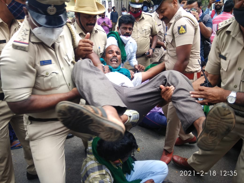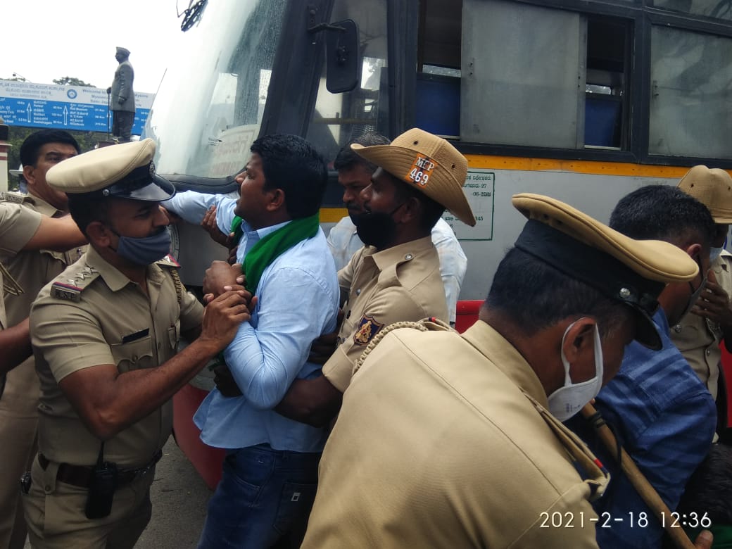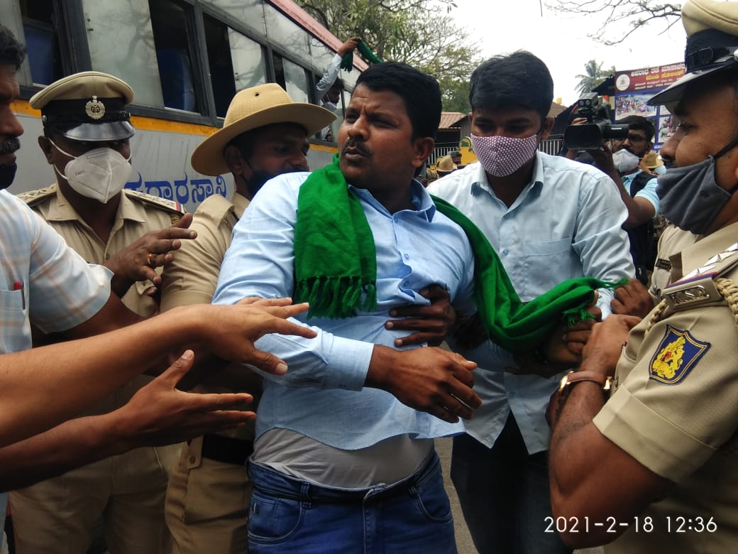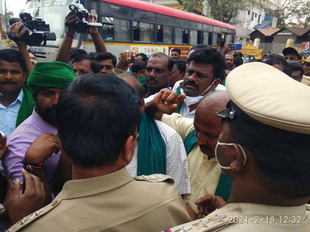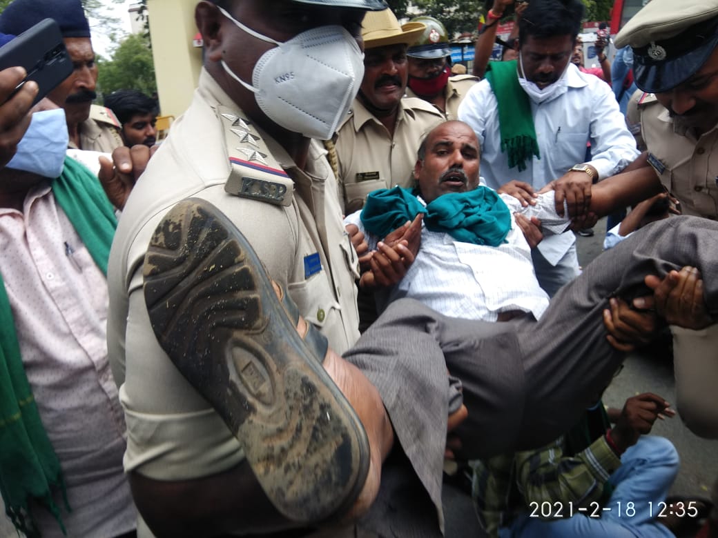 ರೈತರು ರೈಲು ನಿಲ್ದಾಣ ಒಳ ಪ್ರವೇಶ ಮಾಡದಂತೆ ಪೊಲೀಸರು ಮುಂಜಾಗ್ರತೆ ವಹಿಸಿ ರೈಲು ನಿಲ್ದಾಣದ ಮುಂಭಾಗ ಬ್ಯಾರಿಕೇಡ್ ಗಳನ್ನು ಹಾಕಿ ಬಿಗಿ ಪೊಲೀಸ್ ಬಂದೋಬಸ್ತ್ ಮಾಡಿದ್ದರು. ಇದರಿಂದ ರೊಚ್ಚಿಗೆದ್ದ ರೈತರು ರೈಲು ನಿಲ್ದಾಣ ಪ್ರವೇಶದ್ವಾರದ ಮುಂಭಾಗವೇ ಧರಣಿ ಕುಳಿತು ಕೇಂದ್ರ ಮತ್ತು ರಾಜ್ಯ ಸರ್ಕಾರದ ವಿರುದ್ಧ ಧಿಕ್ಕಾರ ಕೂಗಿದರು. ನಂತರ ಒಳಪ್ರವೇಶಿಸಲು ಯತ್ನಿಸುತ್ತಿದ್ದಂತೆ ಪೊಲೀಸರು ಬಂಧಿಸಿದರು.
