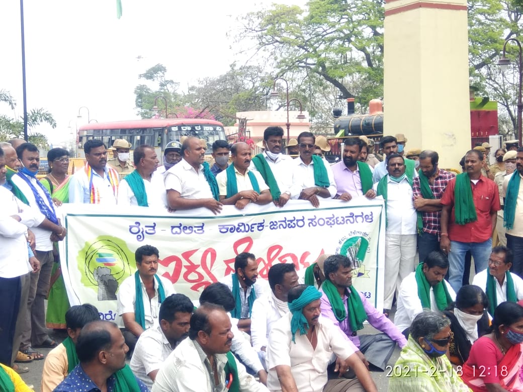 ರೈತ ಕಿಸಾನ್ ಮೋರ್ಚ ಕರೆ ನೀಡಿದ್ದರ ರೈಲು ತಡೆ ಚಳುವಳಿ ಬೆಂನಲಿಸಿ ರೈತ-ದಲಿತ-ಕಾರ್ಮಿಕ ಐಕ್ಯ ಹೋರಾಟ ಸಮಿತಿಯವರು ರಾಜ್ಯ ಕಬ್ಬು ಬೆಳೆಗಾರರ ಸಂಘದವರ ನೇತೃತ್ವದಲ್ಲಿ ಗುರುವಾರ ಮೈಸೂರು ರೈಲು ನಿಲ್ದಾಣದ ಬಳಿ ಜಮಾಯಿಸಿದರು.