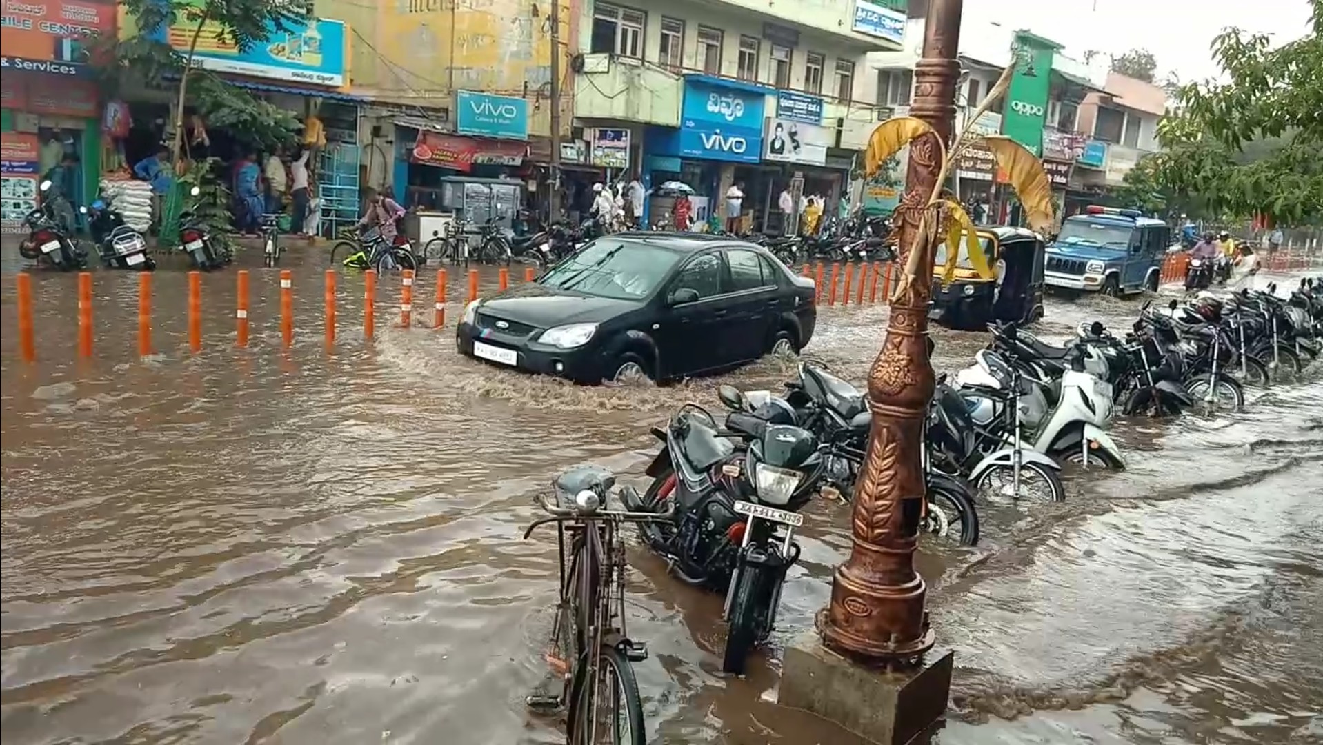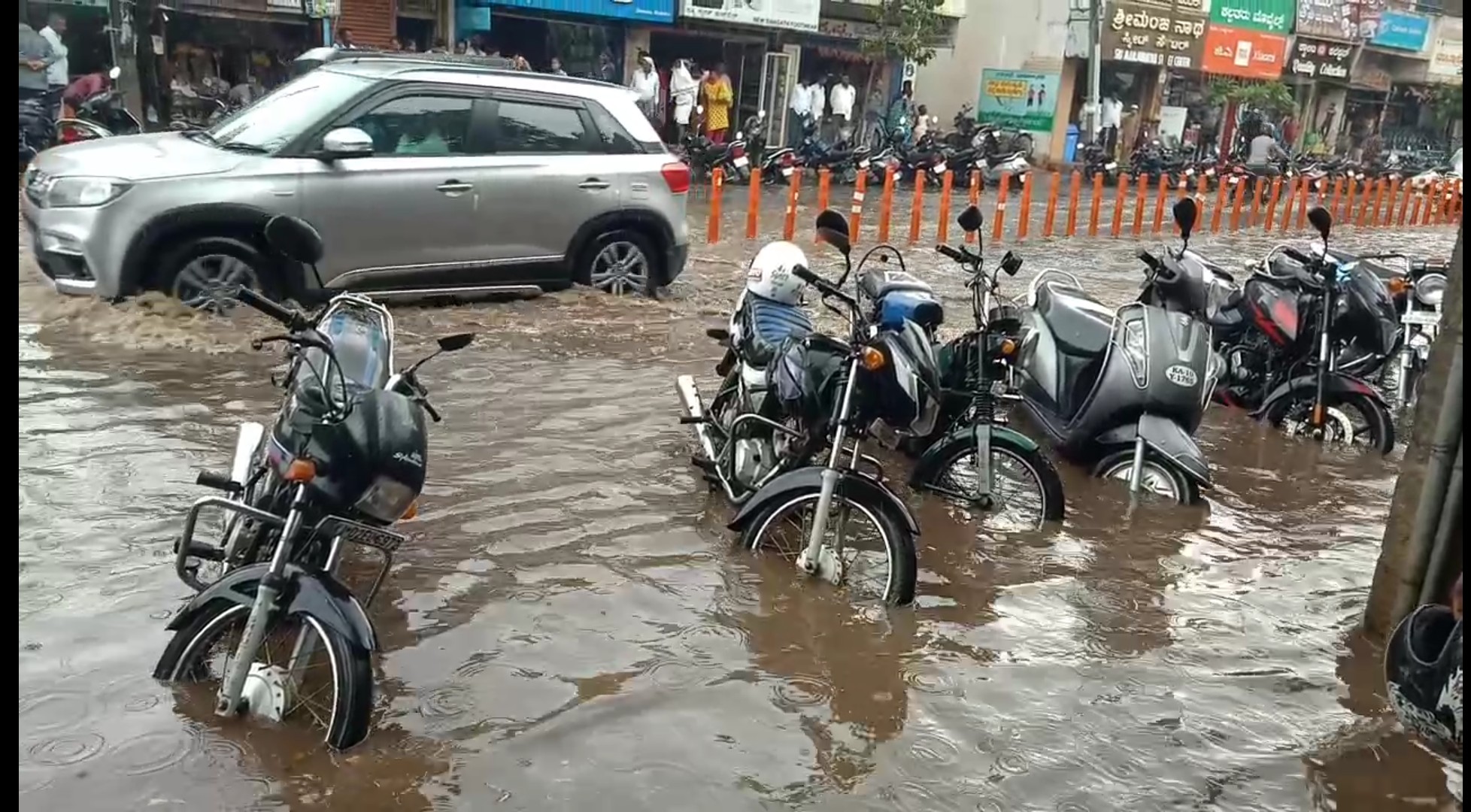 ಜನರ ಪರದಾಟ: ಭಾರೀ ಮಳೆಯಿಂದಾಗಿ ನಗರದಲ್ಲಿ ಜನರು ಪರದಾಡಿದರು. ಚರಂಡಿಯಲ್ಲಿ ನೀರು ಸರಾಗವಾಗಿ ಹರಿಯದೇ ಇದ್ದುದರಿಂದ ಬಿ.ರಾಚಯ್ಯ ಜೋಡಿ ರಸ್ತೆ, ತ್ಯಾಗರಾಜ ರಸ್ತೆ, ಕೆಎಸ್ಆರ್ಟಿಸಿ ಬಸ್ ನಿಲ್ದಾಣ ಸೇರಿದಂತೆ ಹಲವು ಕಡೆಗಳಲ್ಲಿ ನೀರು ನಿಂತುಕೊಂಡು ಕೆರೆಯಾಗಿ ಮಾರ್ಪಟ್ಟಿತು. ಮೊಣಕಾಲಿನವರೆಗೂ ನೀರು ನಿಂತಿತ್ತು. ತಗ್ಗು ಪ್ರದೇಶಗಳಲ್ಲಿರುವ ಅಂಗಡಿಗಳಿಗೆ ಹಾಗೂ ಮನೆಗಳಿಗೆ ನೀರು ನುಗ್ಗಿ ಅಂಗಡಿ ಮಾಲಕರು ಹಾಗೂ ನಿವಾಸಿಗಳು ಪರದಾಡಿದರು.