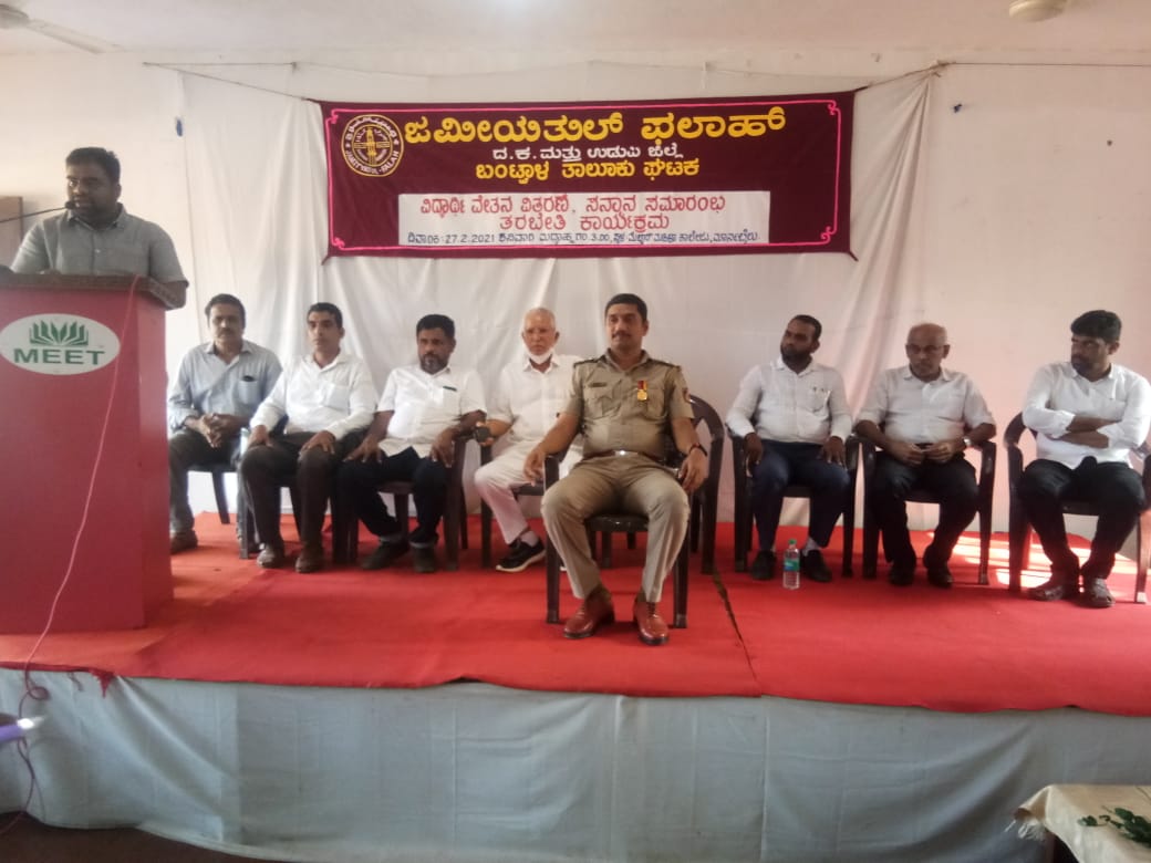 ಜಮೀಯ್ಯತುಲ್ ಫಲಾಹ್ ಬಂಟ್ವಾಳ ತಾಲೂಕು ಘಟಕದ ವತಿಯಿಂದ ಮಾರ್ನಬೈಲ್ ನ ಮೆಲ್ಕಾರ್ ಮಹಿಳಾ ಕಾಲೇಜಿ ನಲ್ಲಿ ಶನಿವಾರ ನಡೆದ ವಿದ್ಯಾರ್ಥಿ ವೇತನ ವಿತರಣೆ, ಸನ್ಮಾನ ಸಮಾರಂಭ ಹಾಗೂ ತರಬೇತಿ ಕಾರ್ಯಕ್ರಮದಲ್ಲಿ ಸನ್ಮಾನ ಸ್ವೀಕರಿಸಿ ಮಾತನಾಡಿದ ಅವರು ಇಲಾಖೆ ಅಥವಾ ಅಧಿಕಾರಿಗಳು ಯಾವುದೇ ಸಾಧನೆ ಮಾಡಬೇಕಾದರೆ ಸಾರ್ವಜನಿಕರ ಸಹಕಾರ ಅತೀ ಅಗತ್ಯ, 99 ಶೇಕಡಾ ಉತ್ತಮ ಜನತೆಯನ್ನು ಹೊಂದಿದ ಬಂಟ್ವಾಳದಲ್ಲಿ ಕರ್ತವ್ಯ ನಿರ್ವಹಿಸುವುದು ನನಗೆ ಹೆಮ್ಮೆಯಾಗಿದೆ ಎಂದರು.