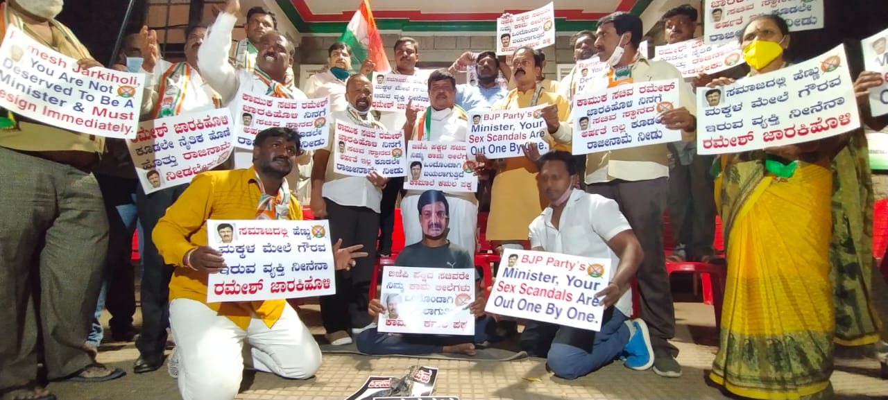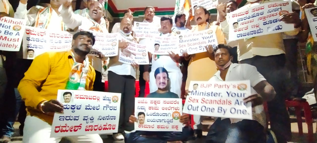 ಸಚಿವ ರಮೇಶ್ ಜಾರಕಿಹೊಳಿ ರಾಜೀನಾಮೆಗೆ ಆಗ್ರಹಿಸಿ ಕಾಂಗ್ರೆಸ್ ಧರಣಿ