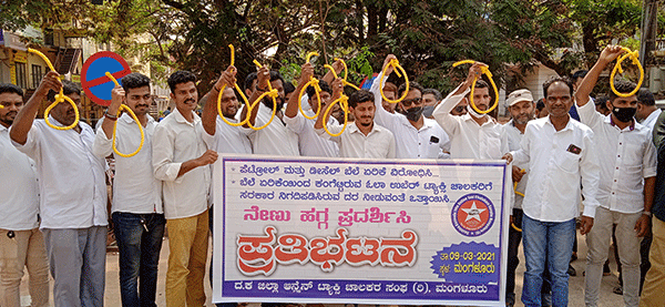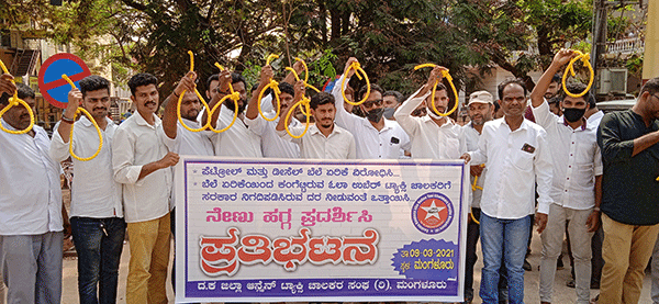 ಮಂಗಳೂರು: ಇಂಧನ ತೈಲ ಬೆಲೆಯೇರಿಕೆ ವಿರುದ್ಧ ಆನ್ಲೈನ್ ಟ್ಯಾಕ್ಸಿ ಚಾಲಕರಿಂದ ನೇಣು ಹಗ್ಗ ಪ್ರದರ್ಶಿಸಿ ಪ್ರತಿಭಟನೆ