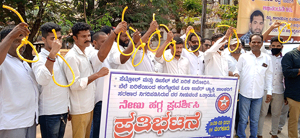 ಮಂಗಳೂರು, ಮಾ.9: ಪೆಟ್ರೋಲ್ ಮತ್ತು ಡೀಸೆಲ್ ಬೆಲೆ ಏರಿಕೆ ವಿರೋಧಿಸಿ, ದ.ಕ. ಜಿಲ್ಲಾ ಆನ್ಲೈನ್ ಟ್ಯಾಕ್ಸಿ ಚಾಲಕರ ಸಂಘದ ನೇತೃತ್ವದಲ್ಲಿಂದು ನೇಣು ಹಗ್ಗ ಪ್ರದರ್ಶಿಸಿ ವಿಶಿಷ್ಟವಾಗಿ ಪ್ರತಿಭಟನೆ ನಡೆಸಲಾಯಿತು.