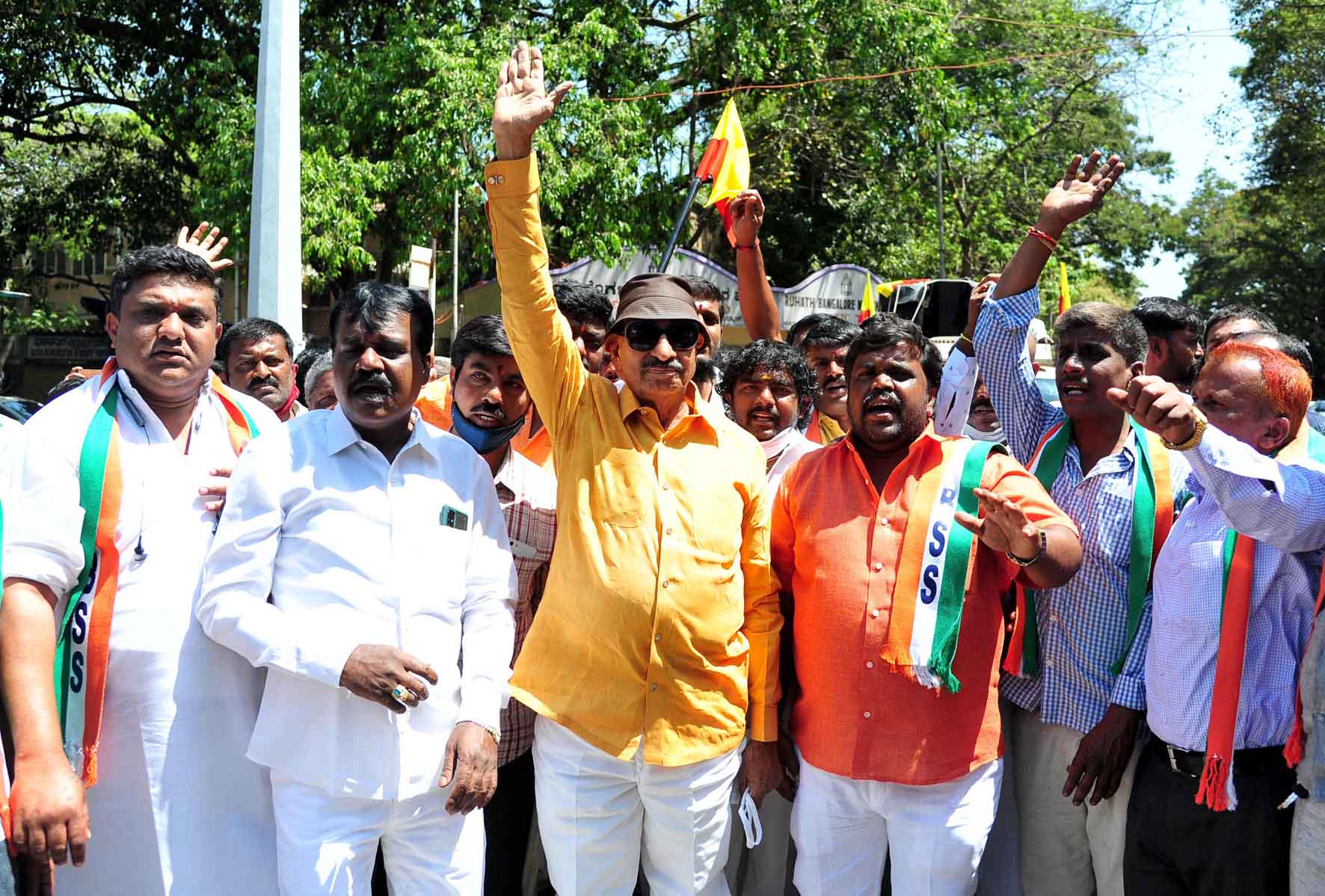 ಬೆಂಗಳೂರು, ಮಾ.13: ಕಾವೇರಿ ನದಿ ಜೋಡಣೆಗೆ ತಮಿಳುನಾಡು ಸರಕಾರ 118 ಕಿ.ಮೀ ಉದ್ದದ ಕಾಲುವೆ ತೋಡಲು ಮುಂದಾಗಿರುವ ಕ್ರಮ ಖಂಡಿಸಿ ಕನ್ನಡ ಚಳುವಳಿ ವಾಟಾಳ್ ನಾಗರಾಜ್ ಪ್ರತಿಭಟನೆ ನಡೆಸಿದರು.