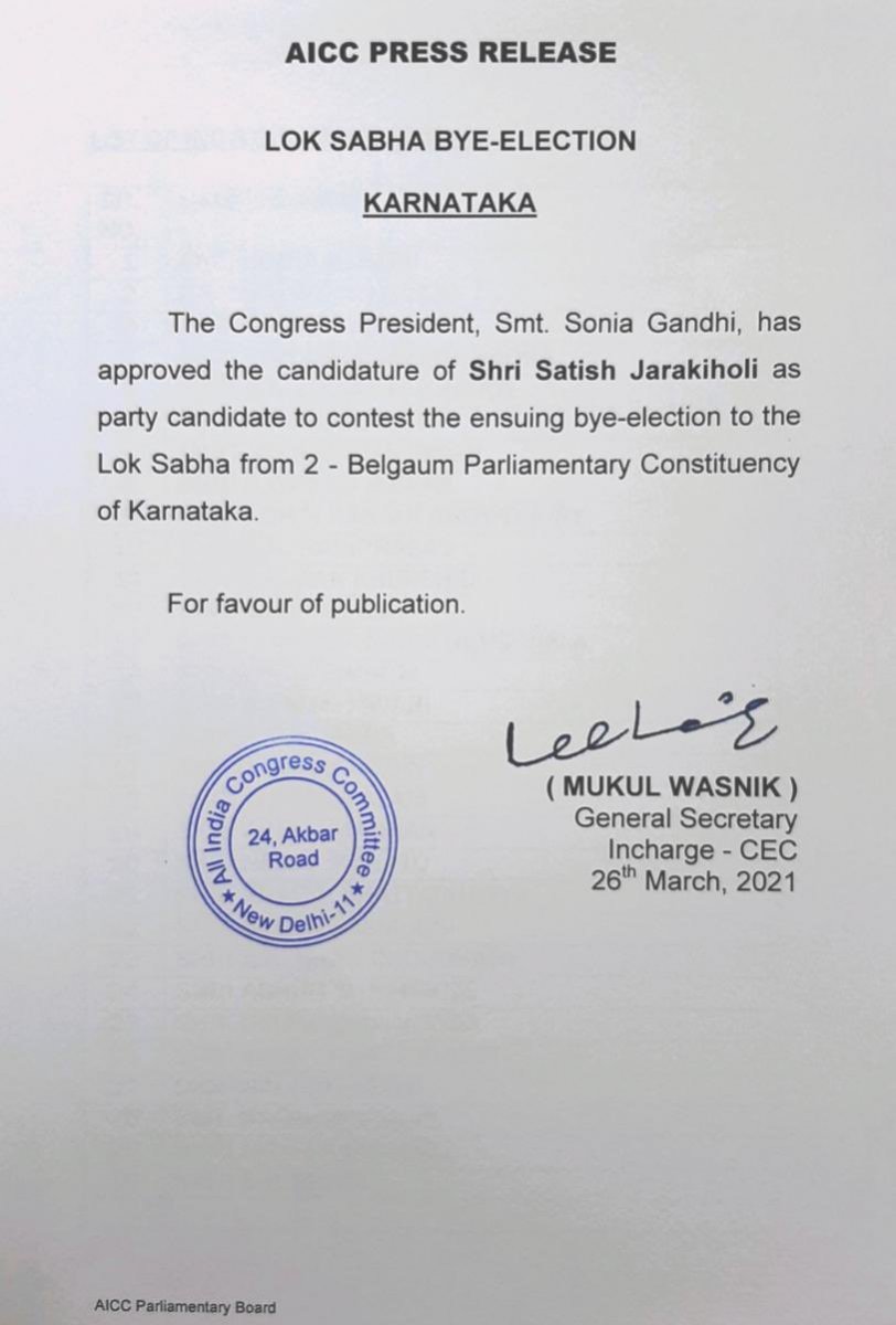 ಶುಕ್ರವಾರ ಎಐಸಿಸಿ ಅಧ್ಯಕ್ಷ ಸೋನಿಯಾ ಗಾಂಧಿ ಅವರು ಕೆಪಿಸಿಸಿ ಕಾರ್ಯಾಧ್ಯಕ್ಷರೂ ಆಗಿರುವ ಸತೀಶ್ ಅವರನ್ನು ಪಕ್ಷದ ಅಭ್ಯರ್ಥಿಯಾಗಿ ನೇಮಿಸಲು ಅನುಮೋದನೆ ನೀಡಿದ್ದಾರೆ ಎಂದು ಎಐಸಿಸಿ ಪ್ರಧಾನ ಕಾರ್ಯದರ್ಶಿ ಹಾಗೂ ಕಾಂಗ್ರೆಸ್ ಚುನಾವಣಾ ಸಮಿತಿ ಉಸ್ತುವಾರಿ ಮುಕುಲ್ ವಾಸ್ನಿಕ್ ಪ್ರಕಟಣೆಯಲ್ಲಿ ಘೋಷಿಸಿದ್ದಾರೆ.