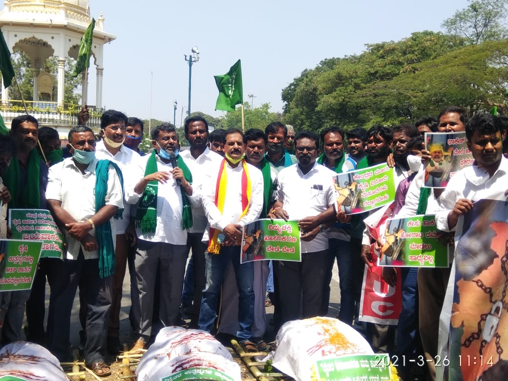 ನಗರದ ಗನ್ ಹೌಸ್ ವೃತ್ತದಲ್ಲಿ ಕರ್ನಾಟಕ ರಾಜ್ಯ ರೈತ ಸಂಘದ ರಾಜ್ಯಾಧ್ಯಕ್ಷ ಬಡಗಲಪುರ ನಾಗೇಂದ್ರ ನೇತೃತ್ವದಲ್ಲಿ ಜಮಾಯಿಸಿದ ಪ್ರತಿಭಟನಾಕಾರರು ಕೇಂದ್ರ ಮತ್ತು ರಾಜ್ಯ ಸರ್ಕಾರಗಳ ವಿರುದ್ಧ ಧಿಕ್ಕಾರ ಕೂಗಿದರು.