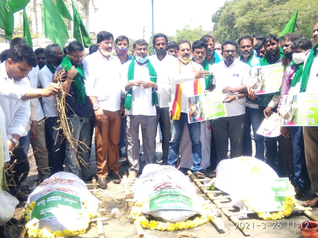 ಮೈಸೂರು : ಕೇಂದ್ರ ಸರ್ಕಾರ ಜಾರಿಗೆ ತಂದಿರುವ ನೂತನ ಕೃಷಿ ಕಾಯ್ದೆ ವಿರೋಧಿಸಿ ನಡೆಸುತ್ತಿರುವ ರೈತರ ಪ್ರತಿಭಟನೆಯ ಅಂಗವಾಗಿ ಇಂದು ಕರೆ ನೀಡಿರುವ ಭಾರತ್ ಬಂದ್ ಬೆಂಬಲಿಸಿ ಮೈಸೂರಿನಲ್ಲಿ ಸಂಯುಕ್ತ ಹೋರಾಟ ಕರ್ನಾಟಕದ ವತಿಯಿಂದ ಅಣಕು ಶವಯಾತ್ರೆ ನಡೆಸಿ ಪ್ರತಿಭಟನೆ ನಡೆಸಿದರು.