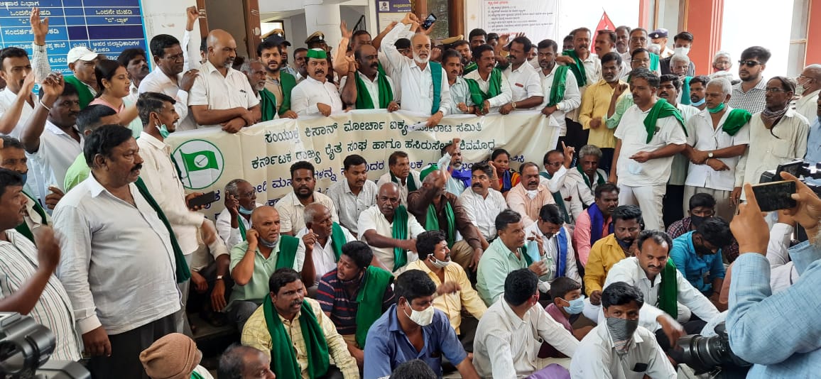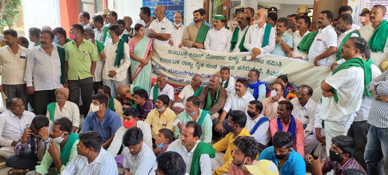ಕೃಷಿ ಕಾನೂನುಗಳನ್ನು ವಿರೋಧಿಸಿ ದಿಲ್ಲಿ ಗಡಿಭಾಗದಲ್ಲಿ ರೈತರು ನಡೆಸುತ್ತಿದ್ದ ಪ್ರತಿಭಟನೆ ನಾಲ್ಕು ತಿಂಗಳು ಪೂರ್ಣಗೊಳಿಸಿರುವ ಹಿನ್ನೆಲೆಯಲ್ಲಿ ಸಂಯುಕ್ತ ಕಿಸಾನ್ ಮೋರ್ಚಾ ಶುಕ್ರವಾರ ಭಾರತ್ ಬಂದ್ ಗೆ ಕರೆ ನೀಡಿತ್ತು. ಶಿವಮೊಗ್ಗದಲ್ಲಿ ಬಂದ್ ಬದಲಾಗಿ ಸಂಯುಕ್ತ ಕಿಸಾನ್ ಮೋರ್ಚಾ ಐಕ್ಯ ಹೋರಾಟ ಸಮಿತಿ, ಕರ್ನಾಟಕ ರಾಜ್ಯ ರೈತ ಸಂಘ, ಹಸಿರು ಸೇನೆ, ವಿವಿಧ ಪ್ರಗತಿಪರ ಸಂಘಟನೆಗಳು ಪ್ರತಿಭಟನೆ ನಡೆಸಿದವು.