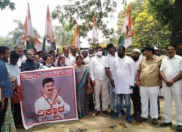 ಸಿಡಿ ಪ್ರಕರಣದಲ್ಲಿ ಆರೋಪಿಯಾಗಿರುವ ಮಾಜಿ ಸಚಿವ ರಮೇಶ್ ಜಾರಕಿಹೊಳಿಯನ್ನು ಬಂಧಿಸುವಂತೆ ಆಗ್ರಹಿಸಿ ಪಂಜಿನ ಮೆರವಣಿಗೆ, ರಸ್ತೆ ತಡೆ, ಪ್ರತಿಕೃತಿ ದಹಿಸುವ ಮೂಲಕ ಕಾಂಗ್ರೆಸ್ ಮುಖಂಡರು ರಾಜ್ಯದ ಹಲವೆಡೆ ಪ್ರತಿಭಟನೆ ನಡೆಸಿದ್ದಾರೆ.