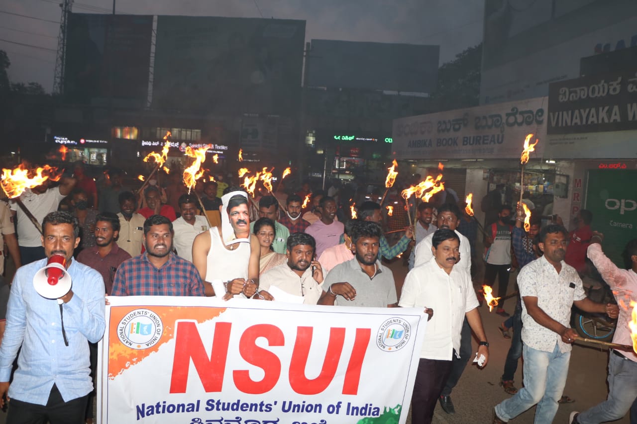 ನಗರದ ಗೋಪಿ ವೃತ್ತದಿಂದ ಮಹಾವೀರ ವೃತ್ತದವರೆಗೆ ಪಂಜಿನ ಮೆರವಣಿಗೆ ನಡೆಸಿದ ಎನ್ಎಸ್ಯುಐ ಕಾರ್ಯಕರ್ತರು, ಪಂಜಿನ ಮೆರವಣಿಗೆಯಲ್ಲಿ ರಮೇಶ್ ಜಾರಕಿಹೊಳಿ ಮುಖವಾಡ ಧರಿಸಿದ್ದ ವ್ಯಕ್ತಿಯ ಕೈಗೆ ಚೈನ್ ಕಟ್ಟಿ ಎಳೆತಂದರು. ಮೆರವಣಿಗೆ ಉದ್ದಕ್ಕೂ 'ರಮೇಶ್ ಜಾರಕಿಹೊಳಿಯನ್ನು ಬಂಧಿಸಬೇಕು' ಎಂದು ಪ್ರತಿಭಟನಾನಿರತರು ಆಗ್ರಹಿಸಿದರು.