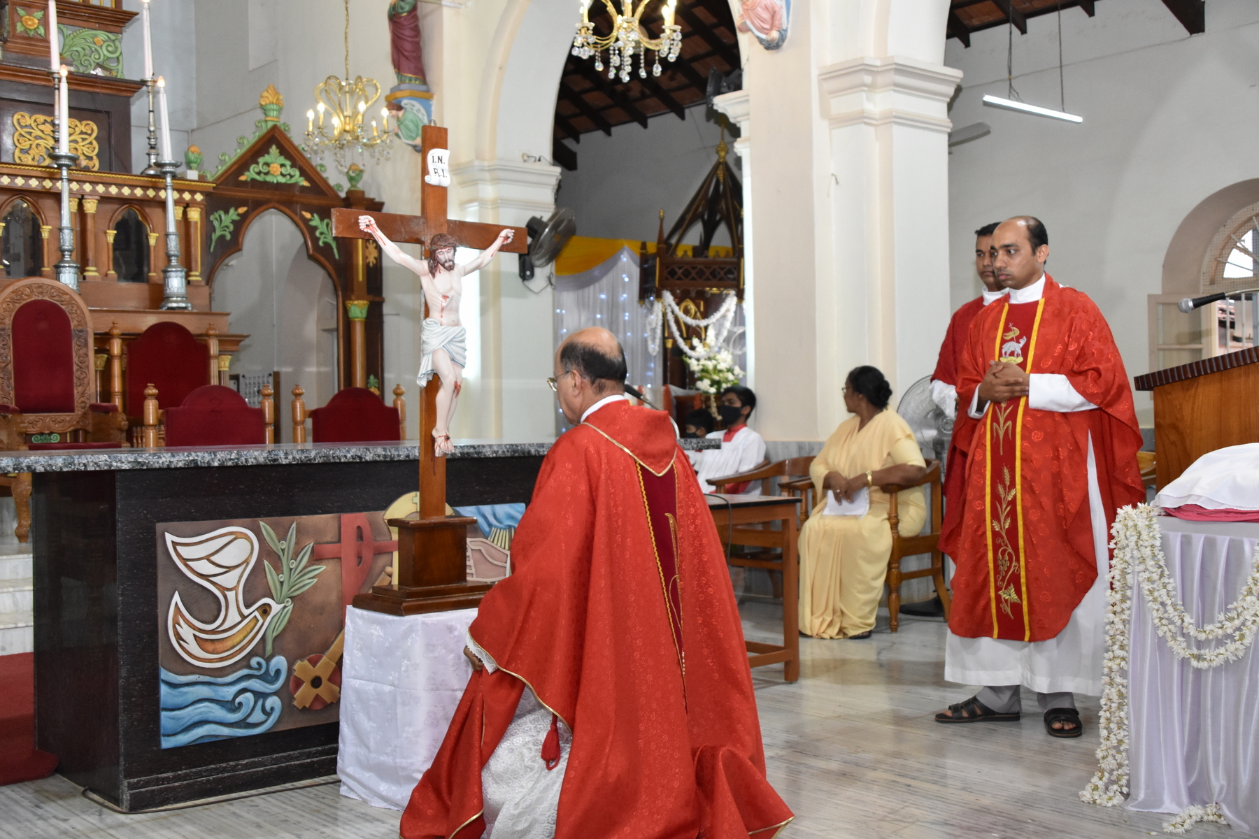 ಚರ್ಚಿನಲ್ಲಿ ಧರ್ಮಗುರುಗಳು ರಕ್ತವರ್ಣದ ಪೂಜಾ ಬಟ್ಟೆಯನ್ನು ಧರಿಸಿ ಯೇಸು ಕ್ರಿಸ್ತನ ಕೊನೆಯ ಗಳಿಗೆಗಳ ವೃತ್ತಾಂತ ಓದಿದರು. ಬಳಿಕ ಶಿಲುಬೆಯನ್ನು ಮೆರವಣಿಗೆಯಲ್ಲಿ ತಂದು ಭಕ್ತರು ನಮನ ಸಲ್ಲಿಸಿ, ತಮ್ಮ 40 ದಿನಗಳ ತ್ಯಾಗದ ಉಳಿಕೆಯ ಹಣವನ್ನು ಬಡ ಬಗ್ಗರಿಗಾಗಿ ನೀಡಿದರು.