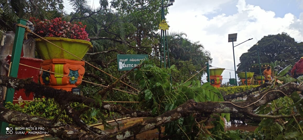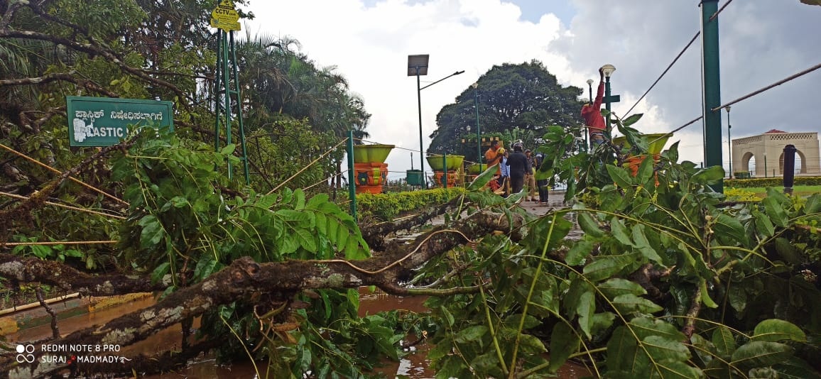 ಮಡಿಕೇರಿ ನಗರದಲ್ಲಿ ಸುಮಾರು ಒಂದು ಗಂಟೆ ಸುರಿದ ಮಳೆಗೆ ಚರಂಡಿ ಮತ್ತು ರಸ್ತೆಗಳಲ್ಲಿ ನೀರು ತುಂಬಿ ಹರಿದಿದೆ. ರಾಜಾಸೀಟು ಉದ್ಯಾವನದ ಆವರಣದಲ್ಲಿ ಮರವೊಂದು ಬಿದ್ದು ಹಾನಿಯಾಗಿದೆ. ಮಂಗಳೂರು ರಸ್ತೆಯ ಒಂದು ಬದಿಯ ಬರೆ ಕುಸಿದಿದ್ದು, ನಿರಂತರ ಮಳೆಯಾದರೆ ರಸ್ತೆಗೆ ಹಾನಿಯಾಗುವ ಸಾಧ್ಯತೆಗಳಿದೆ.