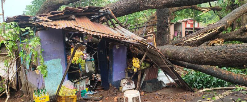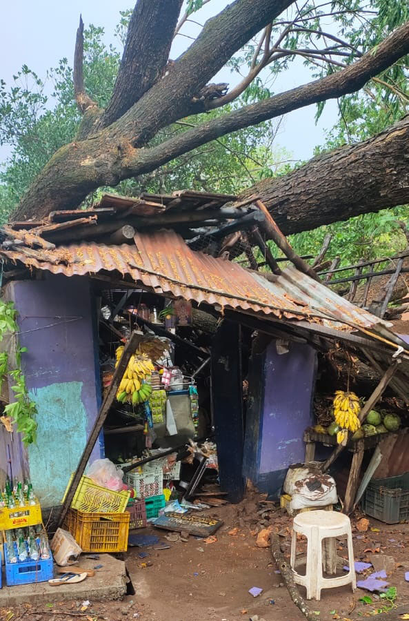 ಇಂದು ಸಂಜೆ 4:15ರ ಸುಮಾರಿಗೆ ಗುಡುಗು-ಸಿಡಿಲು ಸಹಿತ ಗಾಳಿ ಬೀಸಿದ್ದು, ಇದಕ್ಕೆ ಹಳೆಯ ಭಾರೀ ಗಾತ್ರದ ಮರವೊಂದು ಗೋಪಾಲ್ ಸೇರಿಗಾರ್ ಎಂಬವರ ಅಂಗಡಿ ಕೋಣೆಯ ಮೇಲೆ ಬಿದ್ದಿದ್ದು, ಅಂಗಡಿ ಸಂಪೂರ್ಣ ಹಾನಿಗೊಳಗಾಗಿದೆ. 60ರಿಂದ 70ಸಾವಿರ ರೂ.ನಷ್ಟದ ಅಂದಾಜು ಮಾಡಲಾಗಿದೆ.