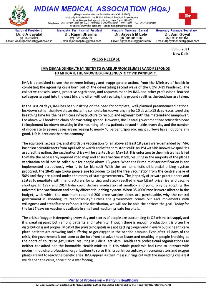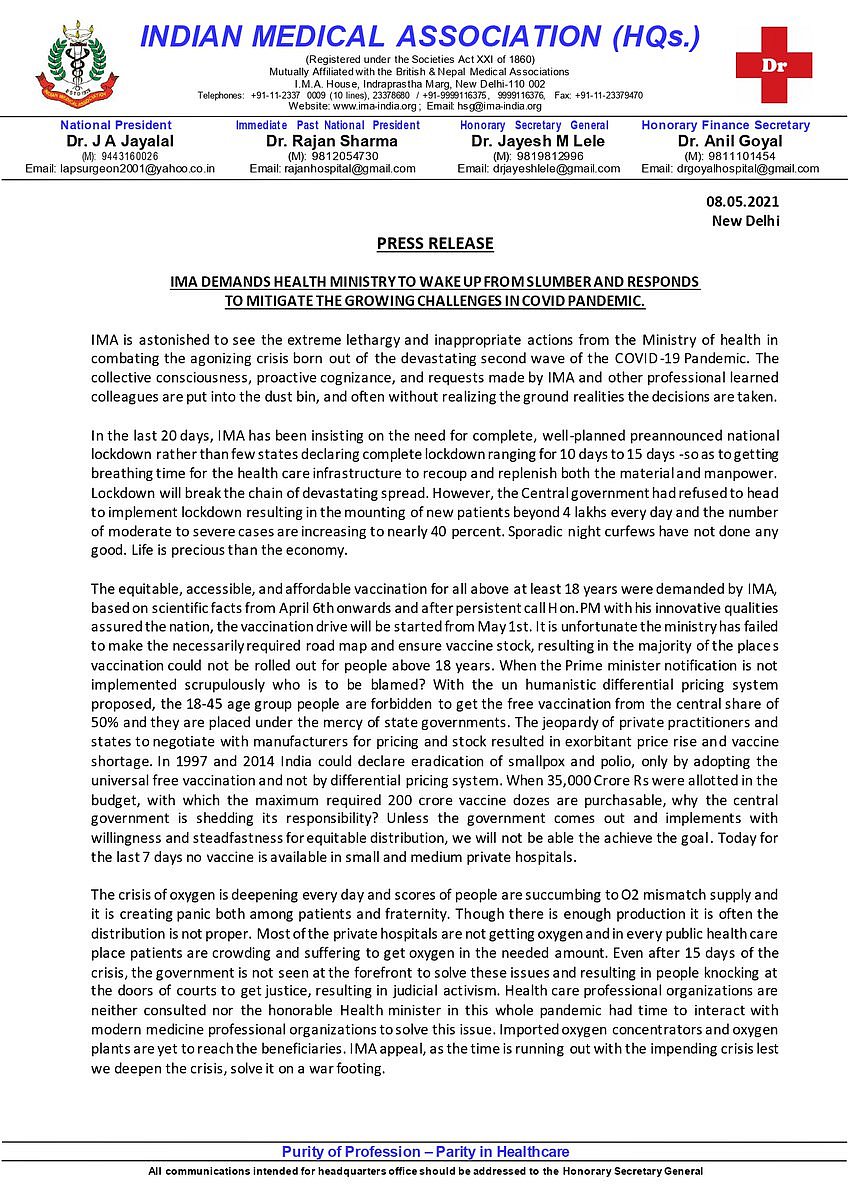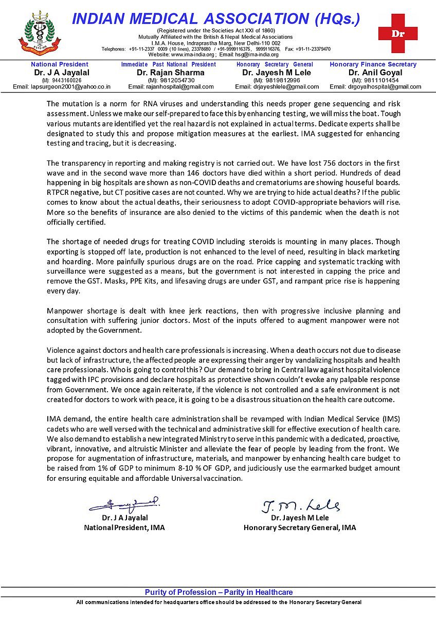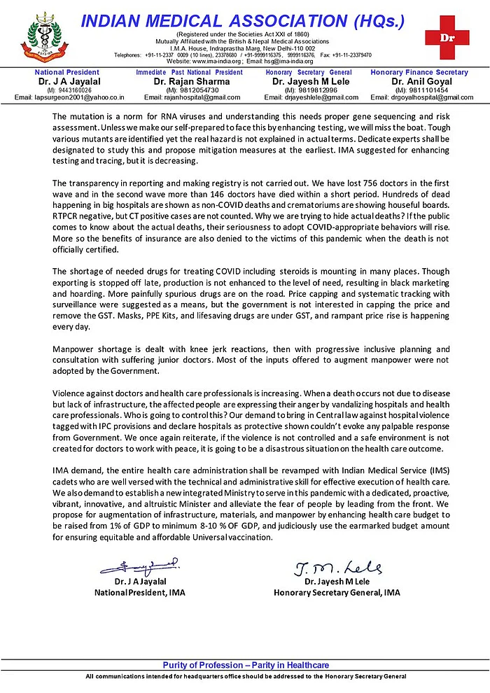 ಪೂರ್ವ ಯೋಜಿತವಾಗಿ, ಮೊದಲೇ ಜನರಿಗೆ ತಿಳುವಳಿಕೆ ನೀಡಿ ಲಾಕ್ ಡೌನ್ ಹೇರುವ ಕುರಿತಾದಂತೆ ಕಳೆದ 20 ದಿನಗಳಿಂದ ಸಂಸ್ಥೆಯು ಒತ್ತಾಯಿಸುತ್ತಿದೆ. ವಿವಿಧ ರಾಜ್ಯಗಳು 10-15 ದಿನಗಳ ಪ್ರತ್ಯೇಕ ಲಾಕ್ ಡೌನ್ ಹೇರುವ ಕುರಿತು ವೈದ್ಯಕೀಯ ಸಂಘವು ವಿರೋಧವನ್ನೂ ವ್ಯಕ್ತಪಡಿಸಿದೆ. ಸಮರ್ಪಕ ಲಾಕ್ ಡೌನ್ ಹೇರುವಿಕೆಯಿದ್ದರೆ ವೈದ್ಯಕೀಯ ಆಡಳಿತಗಳಿಗೂ ಸಿಬ್ಬಂದಿಗೂ ಪರಿಸ್ಥೀತಿಯನ್ನು ನಿಭಾಯಿಸಲು ಸಮರ್ಪಕ ಸಮಯ ದೊರಕುತ್ತಿತ್ತು ಎಂದೂ ಪತ್ರದಲ್ಲಿ ಉಲ್ಲೇಖಿಸಲಾಗಿದೆ.