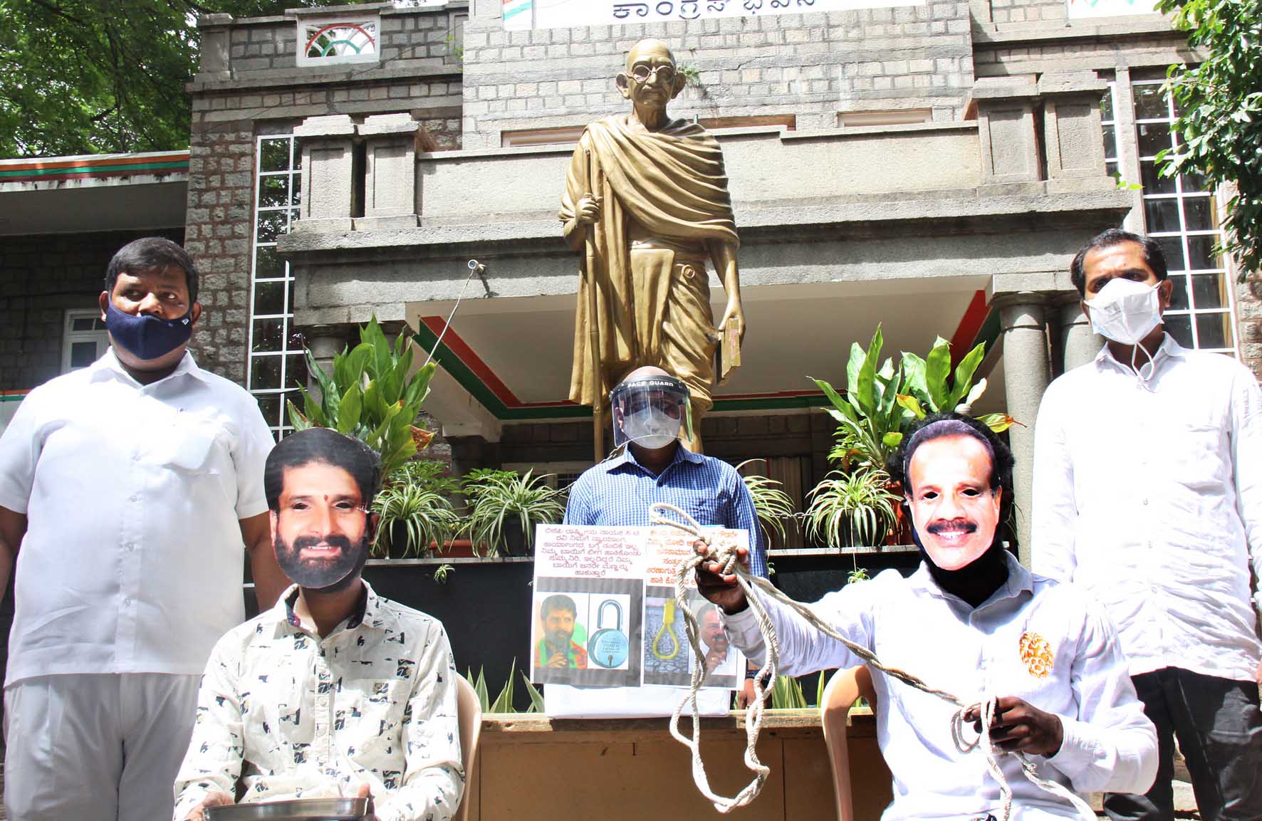 ಶನಿವಾರ ಇಲ್ಲಿನ ರೇಸ್ಕೋರ್ಸ್ ರಸ್ತೆಯ ಕಾಂಗ್ರೆಸ್ ಭವನ ಮುಂಭಾಗ ಜಮಾಯಿಸಿದ ಕಾಂಗ್ರೆಸ್ ಕಾರ್ಯಕರ್ತರು, ಕೋವಿಡ್ ಸಂಬಂಧ ನ್ಯಾಯಮೂರ್ತಿಗಳು ನೀಡಿರುವ ಹೇಳಿಕೆ ಕುರಿತು ಕೇಂದ್ರ ಸಚಿವ ಡಿ.ವಿ. ಸದಾನಂದ ಗೌಡ, ಬಿಜೆಪಿ ರಾಷ್ಟ್ರೀಯ ಪ್ರಧಾನ ಕಾರ್ಯದರ್ಶಿ ಸಿ.ಟಿ.ರವಿ ಮುಖವಾಡ ಧರಿಸಿ, ಭಿಕ್ಷಾಟನೆ ನಡೆಸಿ ಆಕ್ರೋಶ ಹೊರಹಾಕಿದರು.