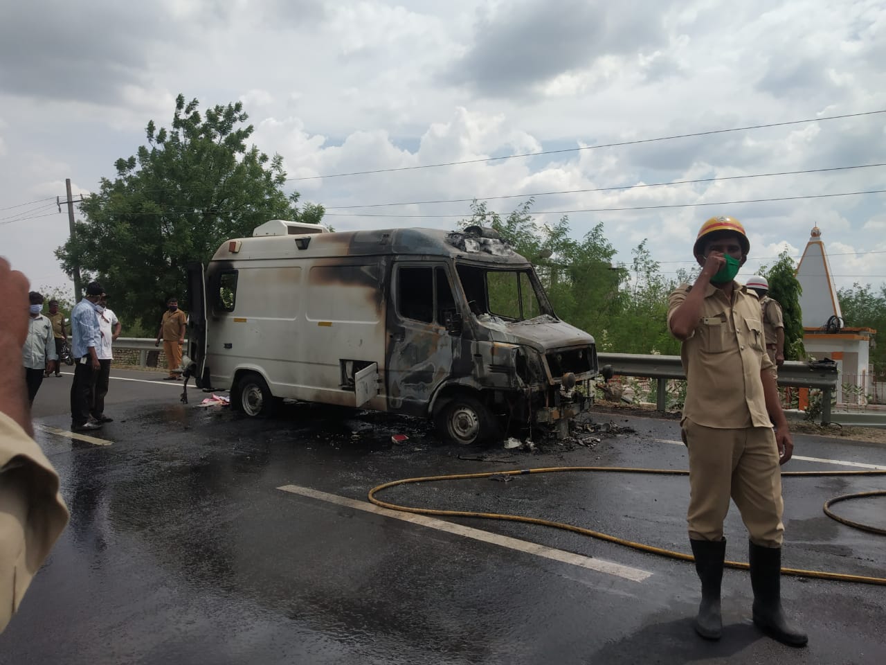 ಕಲಬುರಗಿ: ಖಾಲಿ ಆಕ್ಸಿಜನ್ ಸಿಲಿಂಡರ್ ಕೊಂಡೊಯ್ಯುತ್ತಿದ್ದ ಆ್ಯಂಬುಲೆನ್ಸ್ ಗೆ ಬೆಂಕಿ
