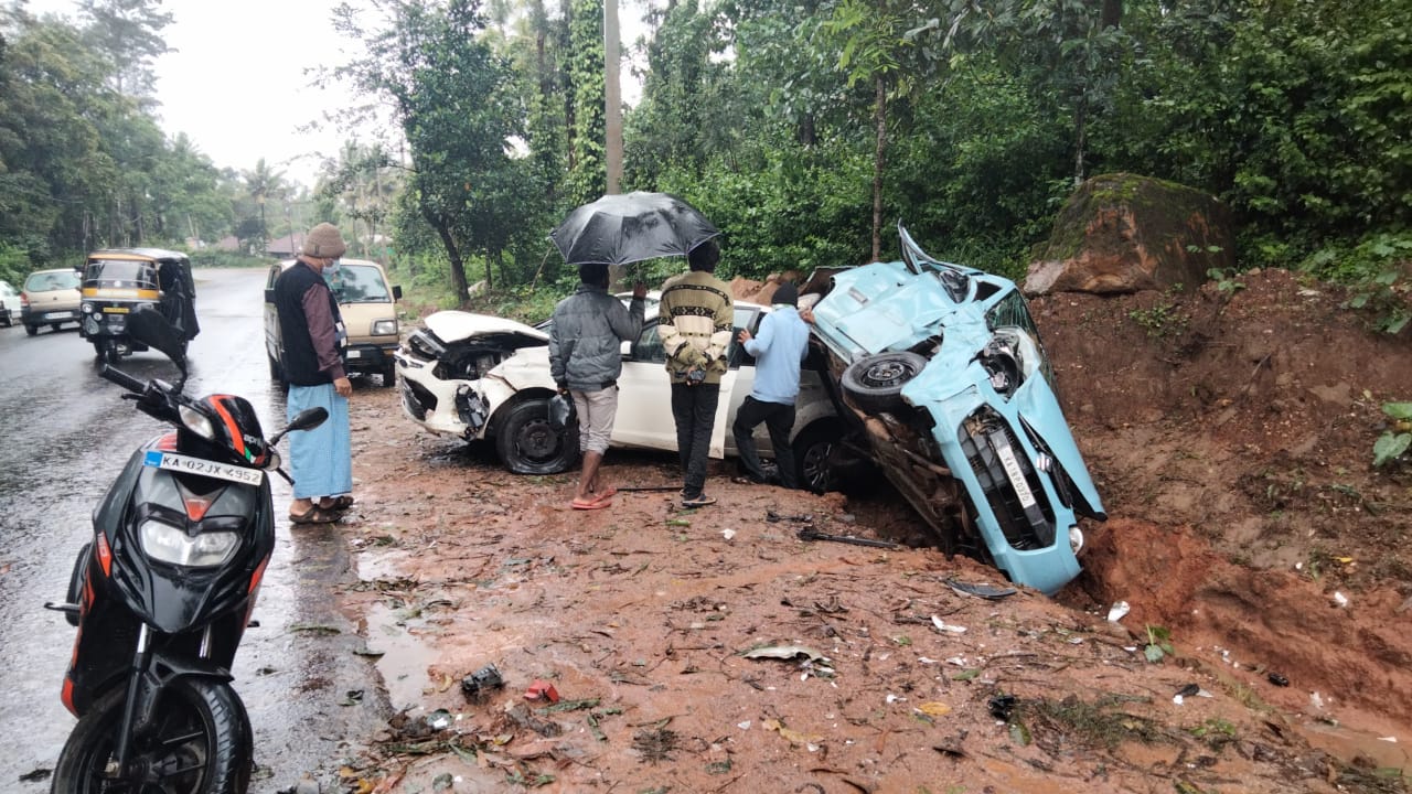 ಮೂಡಿಗೆರೆ ತಾಲೂಕಿನ ಬಿದರಹಳ್ಳಿ ಗ್ರಾಮದ ಬಳಿ ಮುಂಜಾರಿ ಭಾರೀ ಮಳೆಯಿಂದಾಗಿ ರಸ್ತೆ ಕಾಣದೇ ಎರಡು ಕಾರುಗಳ ನಡುವೆ ಮುಖಾಮುಖಿ ಢಿಕ್ಕಿ ಸಂಭವಿಸಿದ್ದು, ಕಾರುಗಳು ನಜ್ಜುಗುಜಾಗಿವೆ. ಕಾರಿನಲ್ಲಿದ್ದವರು ಸಣ್ಣಪುಟ್ಟ ಗಾಯಗಳೊಂದಿಗೆ ಪ್ರಾಣಾಪಾಯದಿಂದ ಪಾರಾಗಿದ್ದಾರೆ. ತಾಲೂಕಿನ ಮುಗ್ರಹಳ್ಳಿ ಗ್ರಾಮದಲ್ಲಿ ಹಳ್ಳವೊಂದಕ್ಕೆ ಅಡ್ಡಲಾಗಿ ನಿರ್ಮಿಸಿರುವ ಸೇತುವೆ ಬಳಿ ನೀರಿನ ರಭಸಕ್ಕೆ ಮಣ್ಣು ಸವಕಳಿಯಾಗಿ ಸೇತುವೆಯೇ ಕುಸಿಯುವ ಹಂತಕ್ಕೆ ತಲುಪಿದ್ದು, ಸೇತುವೆ ಮೇಲೆ ವಾಹನ ಸಂಚಾರವನ್ನು ನಿಷೇದಿಸಲಾಗಿದೆ. ಕಳೆದ ಬಾರಿ ಅತಿವೃಷ್ಟಿ ವೇಳೆ ಈ ಸೇತುವೆಗೆ ಹಾನಿಯಾಗಿದ್ದು, ದುರಸ್ತಿ ಮಾಡದ ಪರಿಣಾಮ ಸೇತುವೆ ಮತ್ತಷ್ಟು ಶಿಥಿಲಗೊಂಡಿತ್ತು. ತಾಲೂಕಿನ ಚಾರ್ಮಾಡಿ ಘಾಟ್ ಸೇರಿದಂತೆ ವಿವಿಧ ಗ್ರಾಮಗಳಲ್ಲಿ ಭೂ ಕುಸಿತವೂ ಉಂಟಾಗಿದ್ದು, ಹೆಚ್ಚು ಹಾನಿಯಾಗಿರುವ ಬಗ್ಗೆ ವರದಿಯಾಗಿಲ್ಲ.