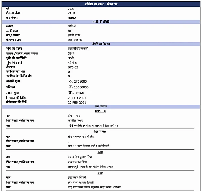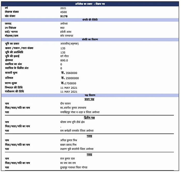 ಜಮೀನು ವ್ಯವಹಾರಗಳ ಕುರಿತಾದ ಮಾಹಿತಿಯನ್ನು ಉತ್ತರ ಪ್ರದೇಶದ ಇಂಟಗ್ರೇಟೆಡ್ ಗ್ರೀವೆನ್ಸ್ ರಿಡ್ರೆಸಲ್ ಸಿಸ್ಟಂನಿಂದಲೂ ಕಲೆ ಹಾಕಲಾಗಿದೆ. ಈ ಜಮೀನನ್ನು ತಲಾ ಚದರ ಮೀಟರ್ ಗೆ ರೂ 2,247ರಂತೆ ಖರೀದಿಸಿದ್ದ ನಾರಾಯಣ್ ಅದನ್ನು ತಲಾ ಚದರ ಮೀಟರ್ಗೆ ರೂ 28,090ರಂತೆ ಟ್ರಸ್ಟ್ ಗೆ ಮಾರಾಟ ಮಾಡಿದ್ದಾರೆ. ಕೋಟ್ ರಾಮಚಂದ್ರ ಪ್ರದೇಶದ ಅಧಿಕೃತ ದರ ಚದರ ಮೀಟರ್ಗೆ ರೂ 4,000 ಆಗಿದೆ.