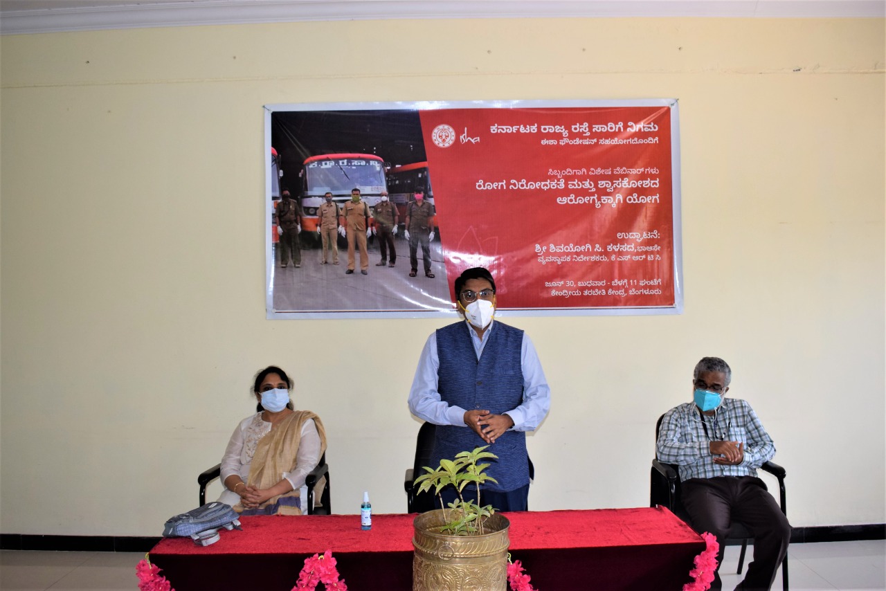 ಬೆಂಗಳೂರು, ಜೂ. 30: ಕರ್ನಾಟಕ ರಾಜ್ಯ ರಸ್ತೆ ಸಾರಿಗೆ ಸಂಸ್ಥೆ(ಕೆಎಸ್ಸಾರ್ಟಿಸಿ) ಸಿಬ್ಬಂದಿಗೆ ಕೋವಿಡ್ ಸಂಕಷ್ಟದ ಸಂದರ್ಭದಲ್ಲಿ ರೋಗ ನಿರೋಧಕ ಶಕ್ತಿ ವೃದ್ಧಿಸಲು ಹಾಗೂ ಶ್ವಾಸಕೋಶವನ್ನು ಕಾಪಾಡಿಕೊಳ್ಳಲು ಈಶಾ ಫೌಂಡೇಶನ್ ಆಶ್ರಯದಲ್ಲಿ `ಸಿಂಹ ಕ್ರಿಯಾ ಯೋಗ' ನಾಳೆ(ಜು.1)ಯಿಂದ ನಡೆಯುವ ಆನ್ಲೈನ್ ಕಾರ್ಯಕ್ರಮಕ್ಕೆ ಕೆಎಸ್ಸಾರ್ಟಿಸಿ ವ್ಯವಸ್ಥಾಪಕ ನಿರ್ದೇಶಕ ಶಿವಯೋಗಿ ಸಿ.ಕಳಸದ ಅವರು ಚಾಲನೆ ನೀಡಿದರು.