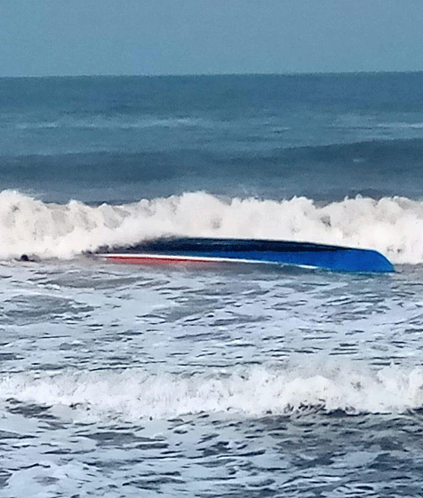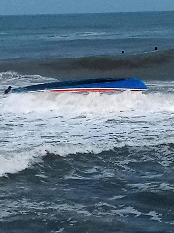 ಮಗುಚಿಬಿದ್ದ ದೋಣಿ ಭಾಗಶಃ ಹಾನಿಗೊಂಡಿದೆ.