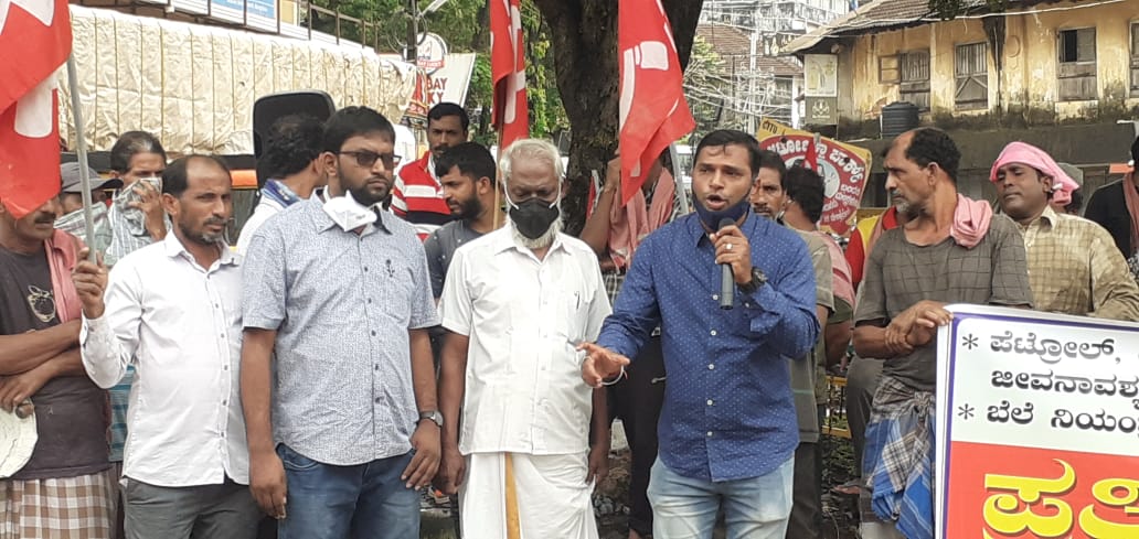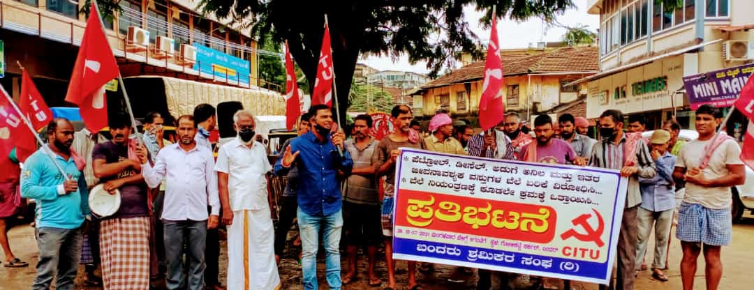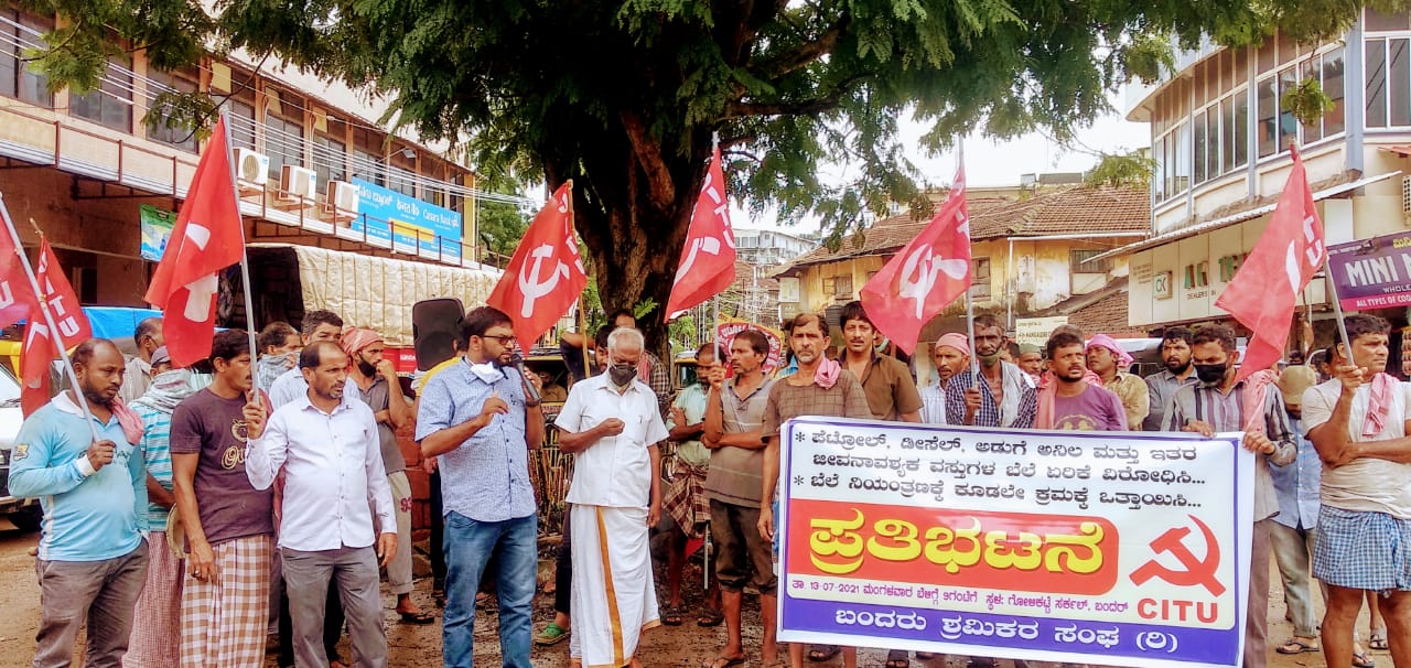 ಮಂಗಳೂರು, ಜು.13: ಪೆಟ್ರೋಲ್, ಡೀಸೆಲ್, ವಿದ್ಯುತ್, ಗ್ಯಾಸ್ ಮತ್ತಿತರ ಜೀವನಾವಶ್ಯಕ ವಸ್ತುಗಳ ಬೆಲೆ ಏರಿಕೆಯನ್ನು ವಿರೋಧಿಸಿ ಬಂದರು ಶ್ರಮಿಕರ ಸಂಘದ ವತಿಯಿಂದ ಹಳೆ ಬಂದರು ಸಗಟು ಮಾರುಕಟ್ಟೆಯ ಗೋಳಿಕಟ್ಟೆ ವೃತ್ತದ ಬಳಿ ಮಂಗಳವಾರ ಪ್ರತಿಭಟನೆ ನಡೆಸಲಾಯಿತು.
