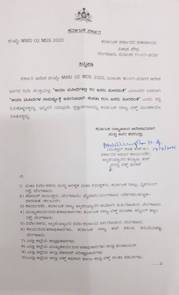 ಬೆಂಗಳೂರು, ಜು.17: ಬಕ್ರೀದ್ ಪ್ರಯುಕ್ತ ಮಸೀದಿಗಳಲ್ಲಿ ನಮಾಝ್ ನಿರ್ವಹಿಸಲು ಅವಕಾಶ ಕಲ್ಪಿಸಿ ರಾಜ್ಯ ಸರಕಾರ ಜು.16ರಂದು ಹೊರಡಿಸಿರುವ ಆದೇಶದಲ್ಲಿ ಆಯಾ ಮಸೀದಿಗಳಲ್ಲಿ 50 ಜನರು ಮೀರದಂತೆ ಎಂಬುದರ ಬದಲಾಗಿ ಆಯಾ ಮಸೀದಿಗಳ ಸಾಮರ್ಥ್ಯಕ್ಕೆ ಅನುಗುಣವಾಗಿ ಶೇ.50ರಷ್ಟು ಜನರು ಮೀರದಂತೆ ಎಂದು ತಿದ್ದಿ ಓದಿಕೊಳ್ಳತಕ್ಕದ್ದು ಎಂದು ಅಲ್ಪಸಂಖ್ಯಾತರ ಕಲ್ಯಾಣ, ಹಜ್ ಮತ್ತು ವಕ್ಫ್ ಇಲಾಖೆಯ ಸರಕಾರದ ಅಧೀನ ಕಾರ್ಯದರ್ಶಿ ಮುಖ್ತಾರ್ ಪಾಷ ಎಚ್.ಜಿ. ತಿದ್ದುಪಡಿ ಆದೇಶದಲ್ಲಿ ಸ್ಪಷ್ಟಪಡಿಸಿದ್ದಾರೆ.