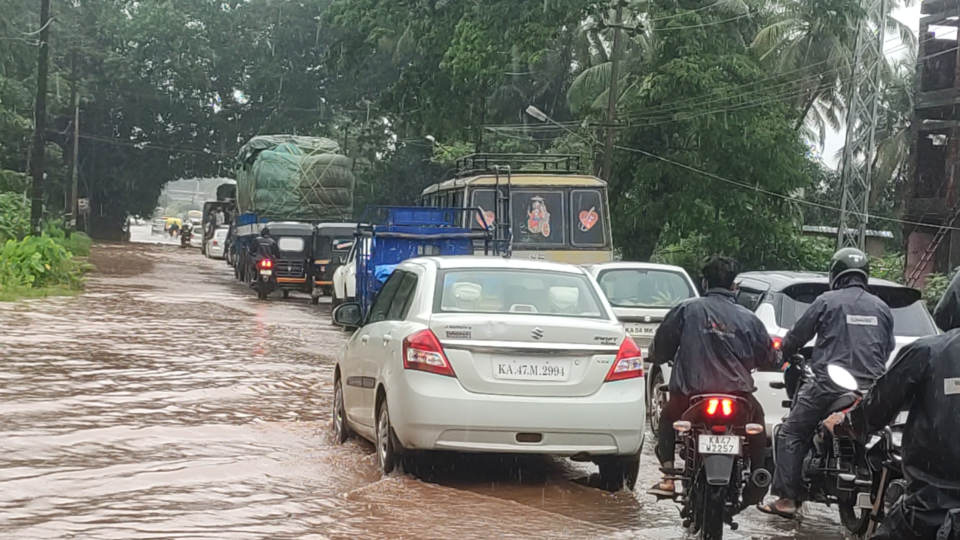 ಶನಿವಾರ ತಡರಾತ್ರಿಯಿಂದ ಮಳೆಯ ಅರ್ಭಟ ಜೋರಾಗಿದ್ದು ನಗರದ ವಿವಿಧ ಪ್ರದೇಶಗಳು ಜಲಾವೃತಗೊಂಡಿವೆ. ಹೆದ್ದಾರಿ 66 ರ ಅಸಮರ್ಪಕ ಕಾಮಾಗಾರಿಗಳಿಂದಾಗಿ ನೀರು ಹರಿದು ಹೋಗಲು ಯಾವುದೇ ವ್ಯವಸ್ಥೆ ಇಲ್ಲದೆ ಇದ್ದುರಿಂದಾಗಿ ಹೆದ್ದಾರಿ ತುಂಬೆಲ್ಲ ಮಳೆನೀರು ನಿಂತಿದ್ದು ಇದರಿಂದಾಗಿ ವಾಹನಗಳ ಓಡಾಟಕ್ಕೆ ಅಡಚಣೆಯುಂಟಾಗಿದೆ ಎಂದು ಸ್ಥಳೀಯರು ದೂರಿದ್ದಾರೆ.