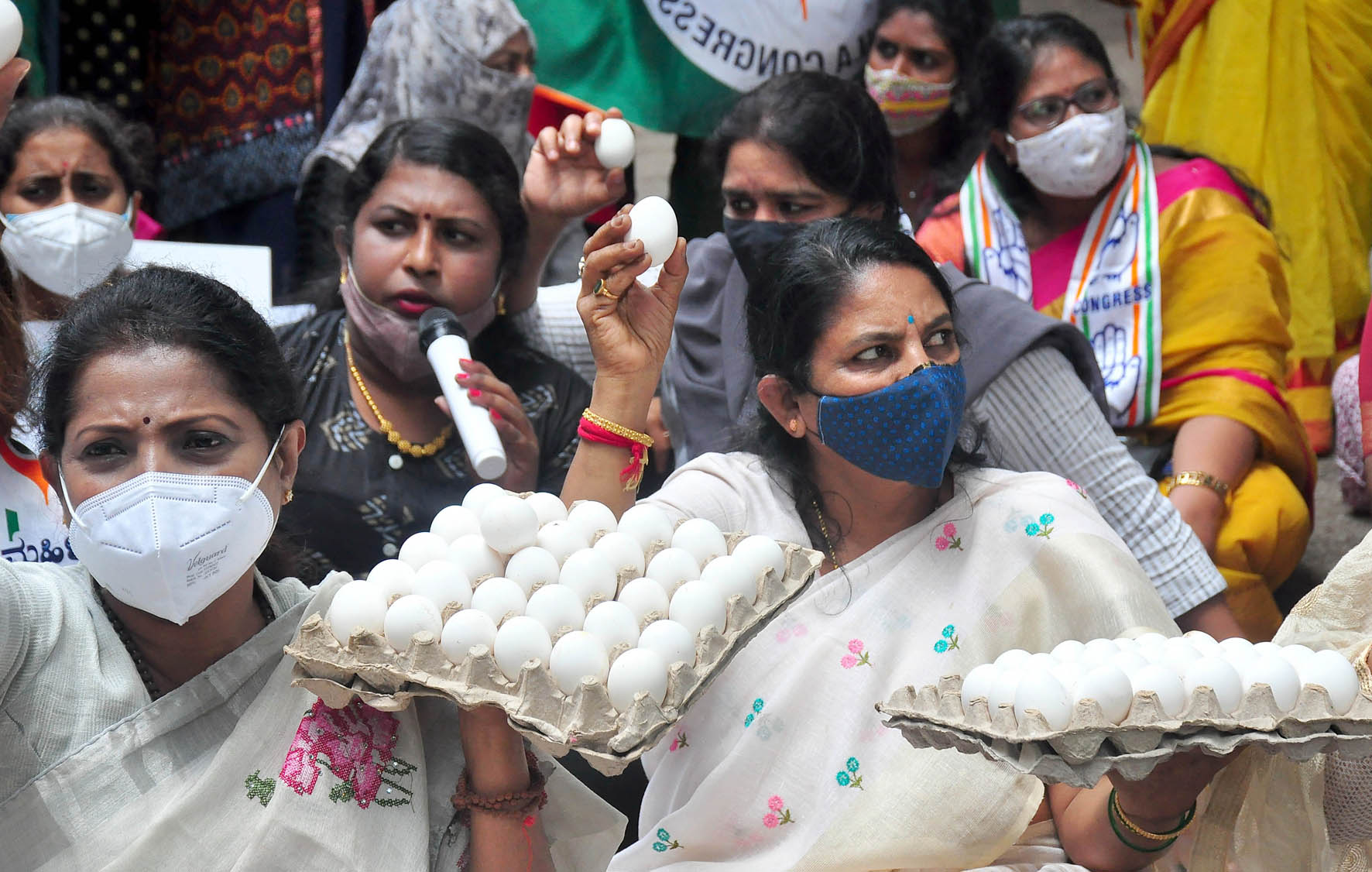 ನಗರದ ರೇಸ್ಕೋರ್ಸ್ ರಸ್ತೆಯಲ್ಲಿರುವ ಕಾಂಗ್ರೆಸ್ ಭವನದ ಆವರಣದಲ್ಲಿ ರಾಜ್ಯ ಮಹಿಳಾ ಕಾಂಗ್ರೆಸ್ ಅಧ್ಯಕ್ಷೆ ಡಾ.ಬಿ.ಪುಷ್ಪಾ ಅಮರನಾಥ್ ನೇತೃತ್ವದಲ್ಲಿ ನೂರಾರು ಮಂದಿ ಕಾರ್ಯಕರ್ತರು ಮಹಿಳಾ ಮತ್ತು ಮಕ್ಕಳ ಅಭಿವೃದ್ಧಿ ಸಚಿವೆ ಶಶಿಕಲಾ ಜೊಲ್ಲೆ ವಿರುದ್ಧ ಮೊಟ್ಟೆಗಳ ಟ್ರೇಗಳನ್ನು ಇಟ್ಟುಕೊಂಡು ಪ್ರತಿಭಟನೆ ನಡೆಸಿದರು. ಅಲ್ಲದೆ, ಸಚಿವರು ಕೂಡಲೆ ತಮ್ಮ ಸ್ಥಾನಕ್ಕೆ ರಾಜೀನಾಮೆ ನೀಡಬೇಕು. ಮುಖ್ಯಮಂತ್ರಿ ಯಡಿಯೂರಪ್ಪ ಈ ಅವ್ಯವಹಾರದ ಕುರಿತು ತನಿಖೆಗೆ ಆದೇಶಿಸಬೇಕು ಎಂದು ಪ್ರತಿಭಟನಾನಿರತರು ಆಗ್ರಹಿಸಿದರು.