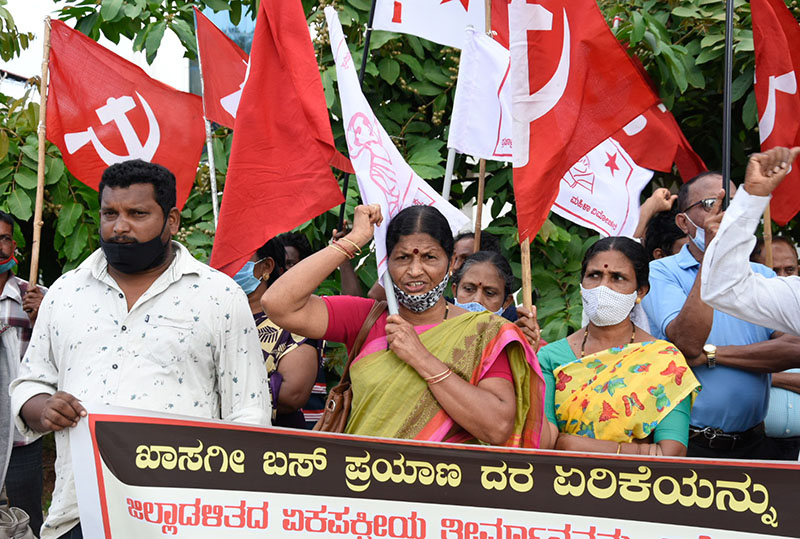 ಮಂಗಳೂರು: ಖಾಸಗಿ ಬಸ್ ಪ್ರಯಾಣ ದರ ಏರಿಕೆ ವಿರೋಧಿಸಿ ಪ್ರತಿಭಟನೆ