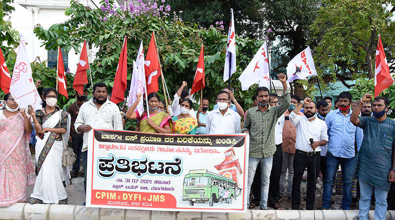 ಮಂಗಳೂರು, ಜು.31: ಖಾಸಗಿ ಬಸ್ ಪ್ರಯಾಣ ದರ ಏರಿಕೆಯನ್ನು ವಿರೋಧಿಸಿ ಮತ್ತು ದ.ಕ. ಜಿಲ್ಲಾಡಳಿತದ ತೀರ್ಮಾನವನ್ನು ಖಂಡಿಸಿ ಸಿಪಿಎಂ, ಡಿವೈಎಫ್ಐ, ಜೆಎಂಎಸ್ ಸಂಘಟನೆ ಶನಿವಾರ ನಗರದ ಕ್ಲಾಕ್ ಟವರ್ ಬಳಿ ಪ್ರತಿಭಟನೆ ನಡೆಸಿತು.