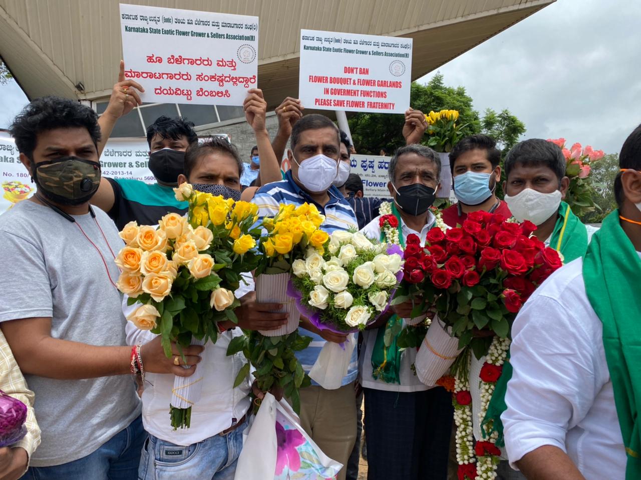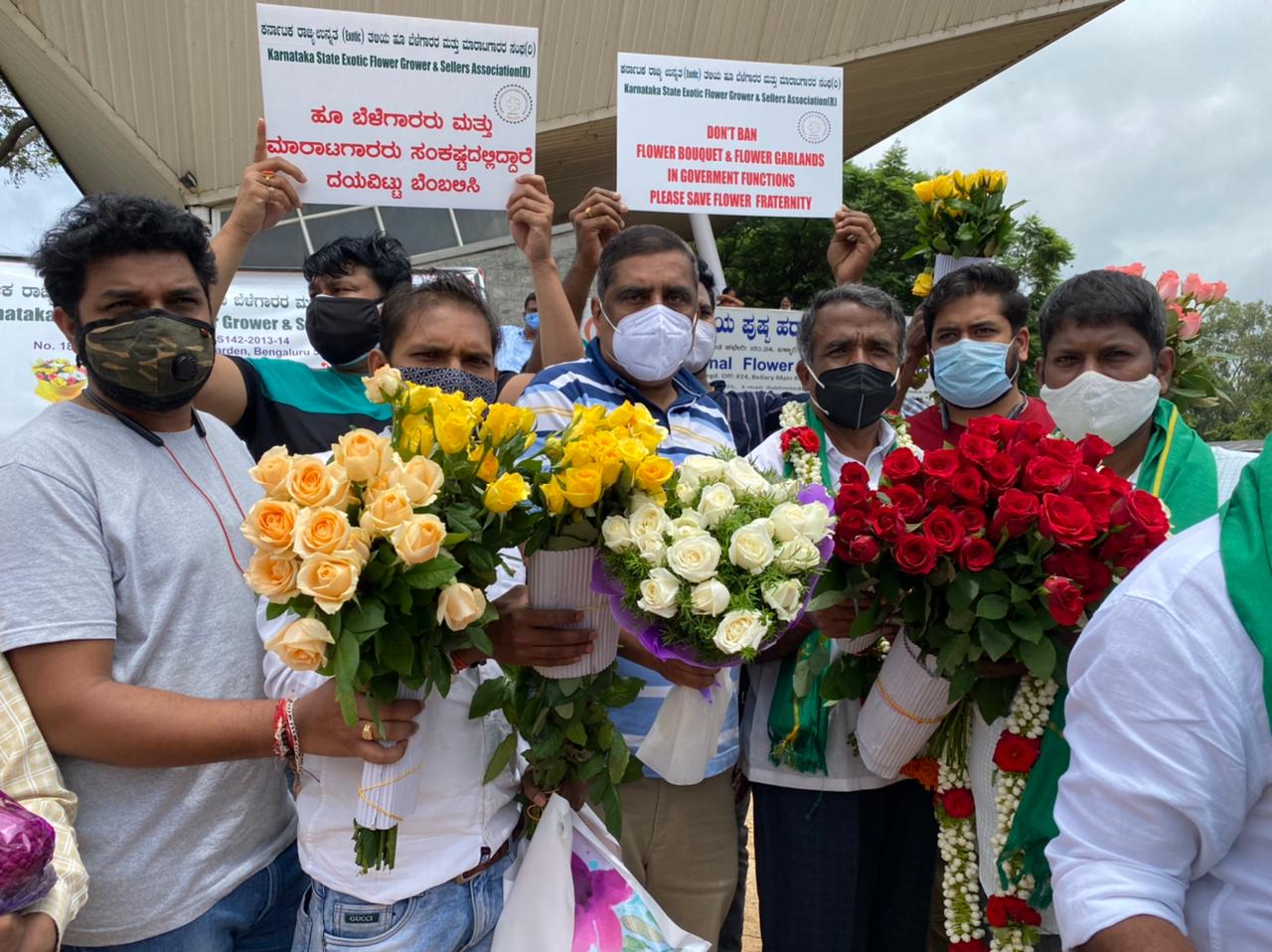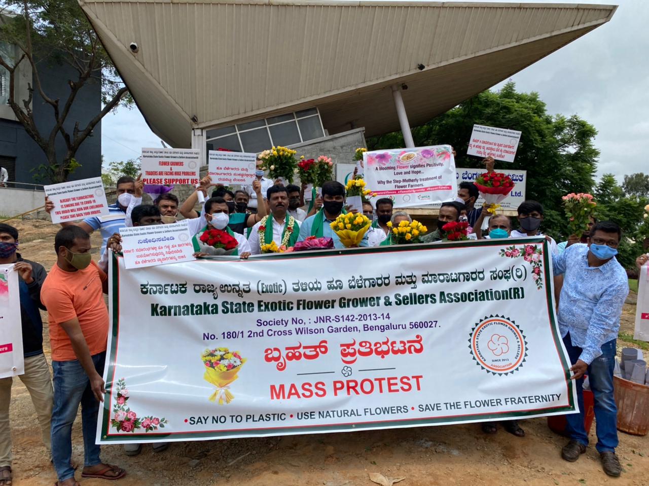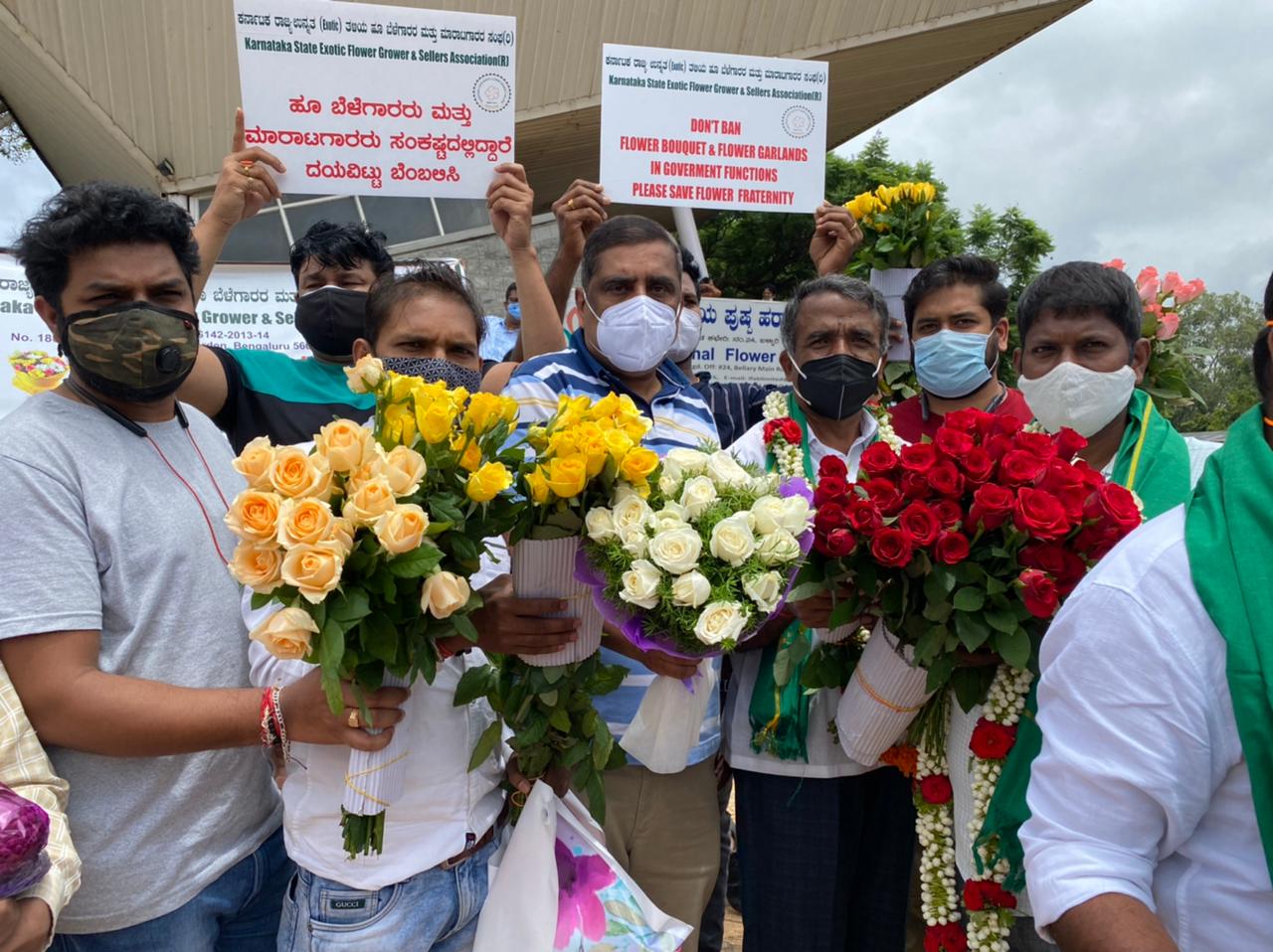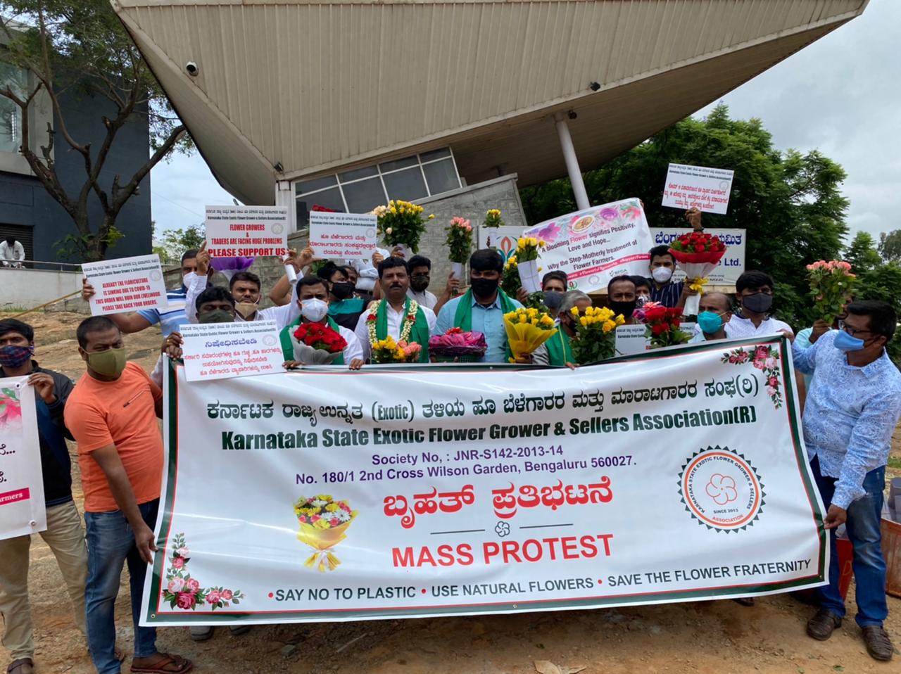 ಹೂಗುಚ್ಛ, ಹಾರ, ಹಣ್ಣಿನ ಬುಟ್ಟಿಯನ್ನು ಹಿಡಿದುಕೊಂಡು ವಿನೂತನವಾಗಿ ನಡೆಸಿದ ಪ್ರತಿಭಟನೆಯಲ್ಲಿ ರಾಜ್ಯದ ಪುಷ್ಪ ಬೆಳೆಗಾರರು ಹಾಗೂ ಪುಷ್ಪ ಬೆಳೆಗಾರರ ರೈತ ಸಂಘಟನೆಗಳು, ರಾಜ್ಯದ ಪುಷ್ಪ ಮಾರಾಟಗಾರರು ಮತ್ತು ಪುಷ್ಪ ಮಾರಾಟಗಾರರ ಸಂಘಗಳ ಪ್ರತಿನಿಧಿಗಳು ಪಾಲ್ಗೊಂಡಿದ್ದರು.