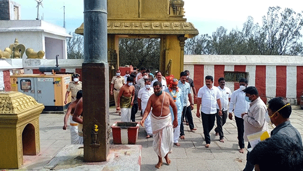 ವಾರಾಂತ್ಯ ಕರ್ಫ್ಯೂ ಜಾರಿಯಲ್ಲಿರುವ ಚಾಮರಾಜನಗರದಲ್ಲಿ ಸಚಿವ ಸೋಮಶೇಖರ್ ರಿಂದ ಕೋವಿಡ್ ನಿಯಮ ಉಲ್ಲಂಘನೆ