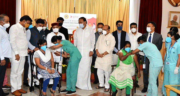 ಸಾಂಕೇತಿಕವಾಗಿ ಇಬ್ಬರು ಮಹಿಳೆಯರಿಗೆ ವ್ಯಾಕ್ಸಿನ್ ನೀಡುವ ಮೂಲಕ ಕಾರ್ಯಕ್ರಮಕ್ಕೆ ಚಾಲನೆ ನೀಡಿದ ಉಪರಾಷ್ಟ್ರಪತಿ, ಸಾರ್ವಜನಿಕರು ಮೈ ಮರೆಯಬಾರದು, ಕಡ್ಡಾಯವಾಗಿ ಆರು ಅಡಿ ಅಂತರ ಕಾಯ್ದುಕೊಳ್ಳಬೇಕು, ಮಾಸ್ಕ್ ಧರಿಸುವುದು, ಕೈ ತೊಳೆಯುಯುವುದನ್ನು ಕಡ್ಡಾಯವಾಗಿ ಪಾಲಿಸಬೇಕು ಎಂದರು.