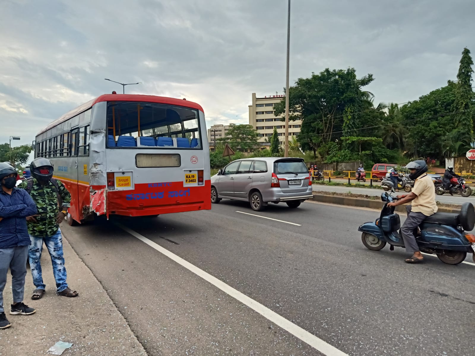 ಶನಿವಾರ ಸಂಜೆ ವೇಳೆ ಕೆಎಸ್ಸಾರ್ಟಿಸಿ ಬಸ್ ಡಿಪೋಗೆ ತೆರಳುತ್ತಿದ್ದಾಗ ಹಿಂದಿನಿಂದ ಬಂದ ಹಾಲಿನ ವಾಹನ ಢಿಕ್ಕಿಯಾಗಿದೆ. ಇದರಿಂದ ಟೆಂಪೋ ಚಾಲಕನ ಕಾಲಿಗೆ ಗಂಭೀರ ಗಾಯವಾಗಿದೆ. ಇದರಿಂದ ಕೆಲ ಹೊತ್ತು ಈ ರಸ್ತೆಯಲ್ಲಿ ಸಂಚಾರಕ್ಕೆ ಅಡಚಣೆ ಉಂಟಾಗಿದೆ.