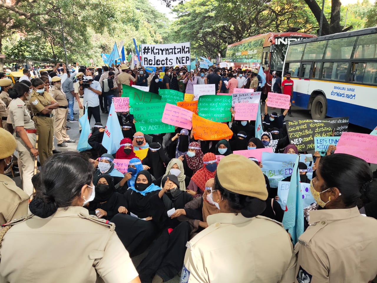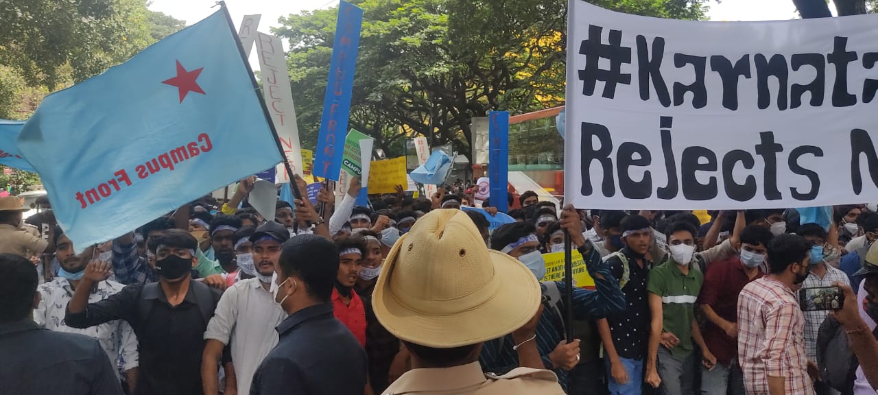 ಮಂಗಳವಾರ ಇಲ್ಲಿನ ಮೈಸೂರು ಬ್ಯಾಂಕ್ ವೃತ್ತದ ಮುಂಭಾಗ ಕ್ಯಾಂಪಸ್ ಫ್ರಂಟ್ ಆಫ್ ಇಂಡಿಯಾ ಸಂಘಟನೆ ನೇತೃತ್ವದಲ್ಲಿ ಜಮಾಯಿಸಿದ ವಿದ್ಯಾರ್ಥಿಗಳು, ಈ ಕೂಡಲೇ ರಾಷ್ಟ್ರೀಯ ಶಿಕ್ಷಣ ನೀತಿ(ಎನ್ಇಪಿ)ಯನ್ನು ಜಾರಿಗೊಳಿಸುವುದನ್ನು ನಿಲ್ಲಿಸಬೇಕೆಂದು ಆಗ್ರಹಿಸಿ ವಿಧಾನಸೌಧ ಮುತ್ತಿಗೆಗೆ ಮುಂದಾದರು.