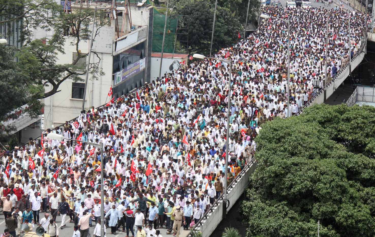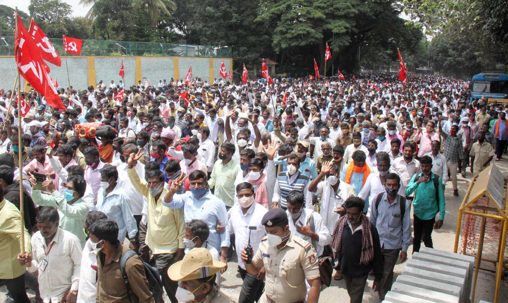ಬುಧವಾರ ನಗರದ ಸಿಟಿ ರೈಲ್ವೇ ನಿಲ್ದಾಣದಿಂದ ಫ್ರೀಡಂ ಪಾರ್ಕ್ವರೆಗೂ ಕರ್ನಾಟಕ ರಾಜ್ಯ ಗ್ರಾಮ ಪಂಚಾಯತ್ ನೌಕರರ ಸಂಘ(ಸಿಐಟಿಯು) ನೇತೃತ್ವದಲ್ಲಿ ಸಾವಿರಾರು ನೌಕರರು ಬೃಹತ್ ಪ್ರತಿಭಟನಾ ಮೆರವಣಿಗೆ ನಡೆಸಿದರು.