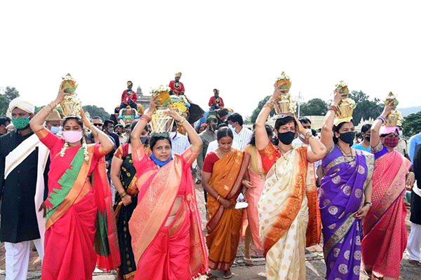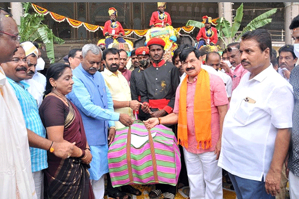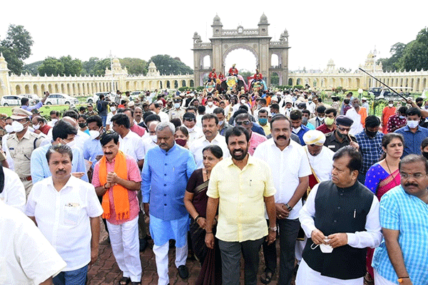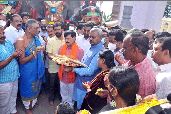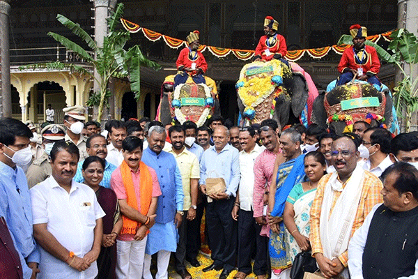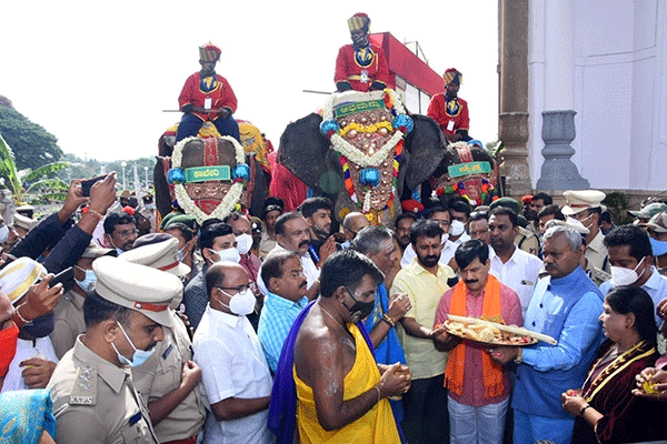 ಅರಮನೆ ಆವರಣದ ಜಯಮಾರ್ತಾಂಡ ದ್ವಾರದಲ್ಲಿ ಬೆಳಗ್ಗೆ 8:36ಕ್ಕೆ ಗಜಪಡೆಗೆ ಸಚಿವ ಸೋಮಶೇಖರ್ ಪೂಜೆ ಸಲ್ಲಿಸಿ, ಪುಷ್ಪಾರ್ಚನೆ ಮಾಡಿ ಗಜಪಡೆಯನ್ನು ಸ್ವಾಗತಿಸಿದರು.