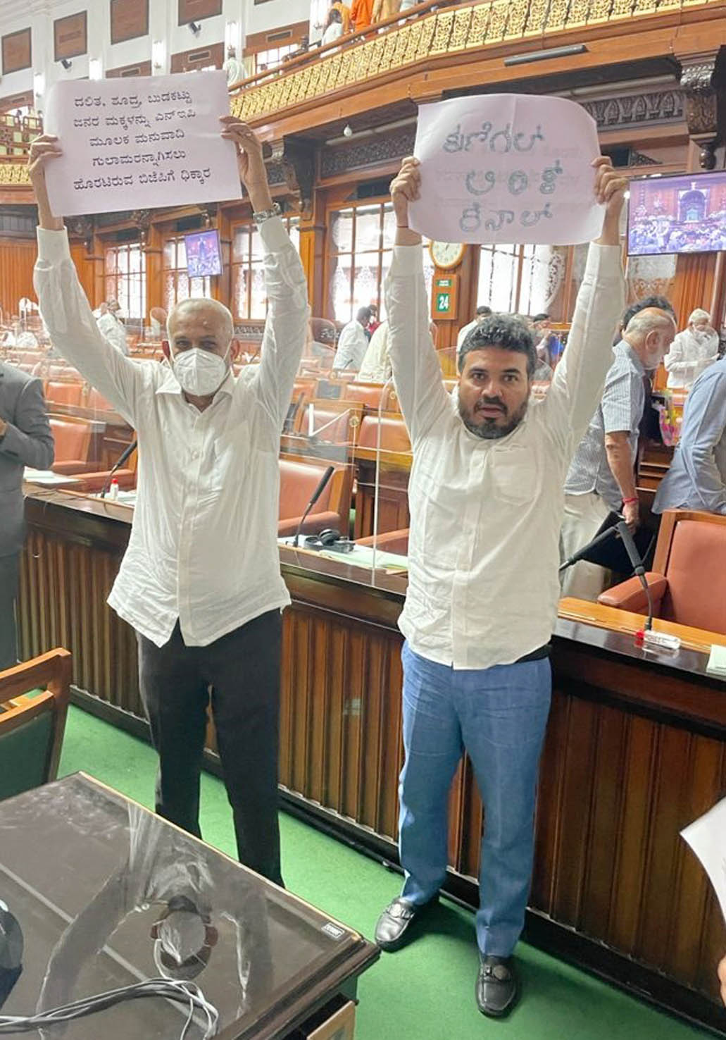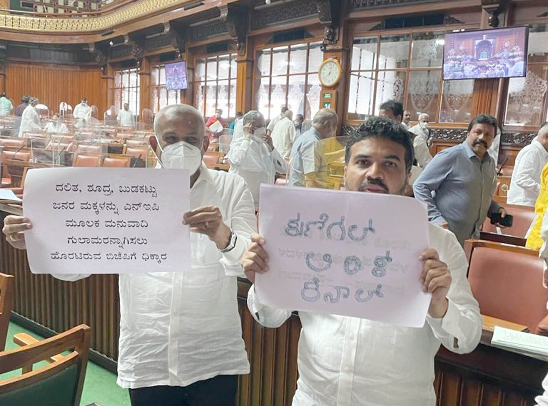 ಶುಕ್ರವಾರ ವಿಧಾನಸಭೆ ಪ್ರಶ್ನೋತ್ತರ ಅವಧಿಯ ಬಳಿಕ ಕಾಂಗ್ರೆಸ್ ಸದಸ್ಯ ಡಾ.ರಂಗನಾಥ್, ಕಂಪ್ಲಿ ಗಣೇಶ್, ಪ್ರಿಯಾಂಕ್ ಖರ್ಗೆ, ಈ.ತುಕರಾಮ್ ಸೇರಿದಂತೆ ಇನ್ನಿತರ ಸಮಸ್ಯೆ ಚರ್ಚೆಗೆ ಅವಕಾಶ ಕೋರಿದರು. ಆದರೆ, ಸ್ಪೀಕರ್ ಕಾಗೇರಿ, `ಸಯಮವಿಲ್ಲ' ಎಂದು ನಿರಾಕರಿಸಿದರು. ಇದರಿಂದ ಆಕ್ರೋಶಿತರರಾದ ಕಾಂಗ್ರೆಸ್ ಸದಸ್ಯರು `ಕುಣಿಗಲ್ ಲಿಂಕ್ ಕೆನಾಲ್, ದಲಿತ, ಶೂದ್ರ, ಬುಡಕಟ್ಟು ಜನರ ಮಕ್ಕಳನ್ನು ಎನ್ಇಪಿ ಮೂಲಕ ಮನುವಾದಿ ಗುಲಾಮರನ್ನಾಗಿಸಲು ಹೊರಟಿರುವ ಬಿಜೆಪಿ ಸರಕಾರಕ್ಕೆ ಧಿಕ್ಕಾರ' ಎಂಬ ಫಲಕವನ್ನು ಹಿಡಿದು ಸ್ಪೀಕರ್ ಪೀಠದ ಮುಂದಿನ ಬಾವಿಗೆ ಧಾವಿಸಿದರು.