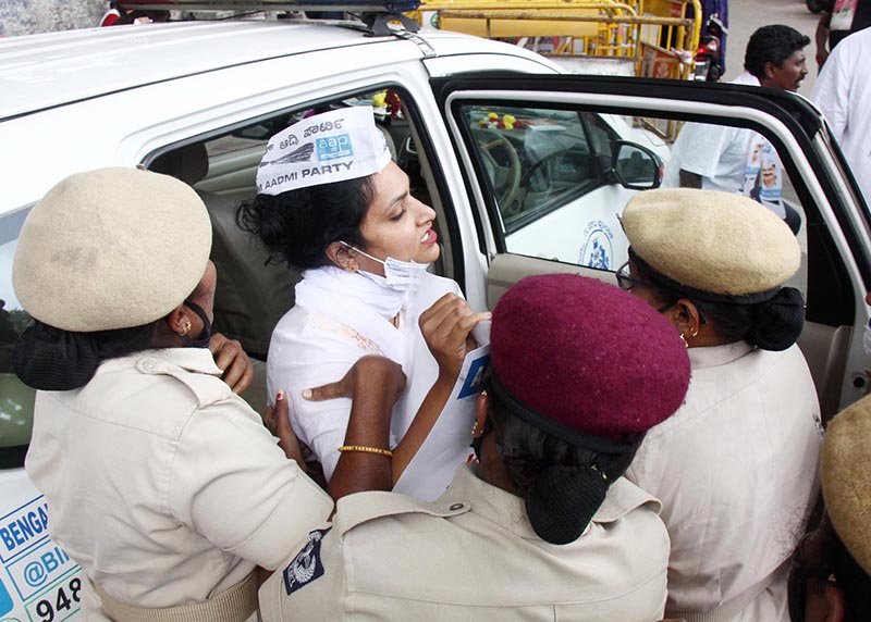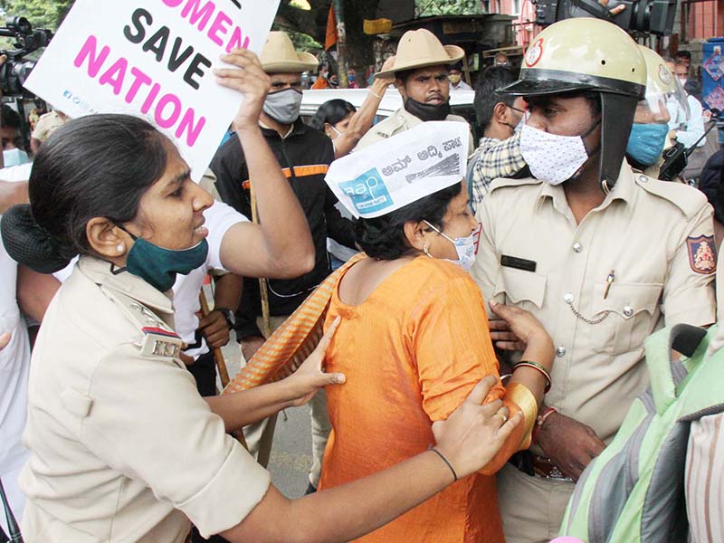 ಬೆಂಗಳೂರು: ಮಹಿಳಾ ಆಯೋಗದ ಎದುರು ಆಪ್ ಪ್ರತಿಭಟನೆ